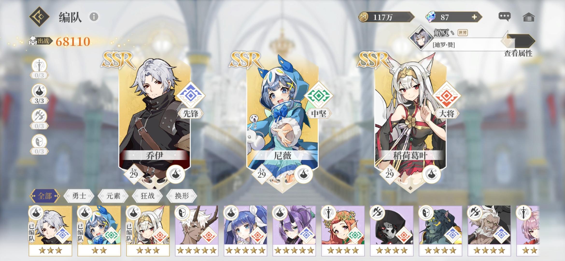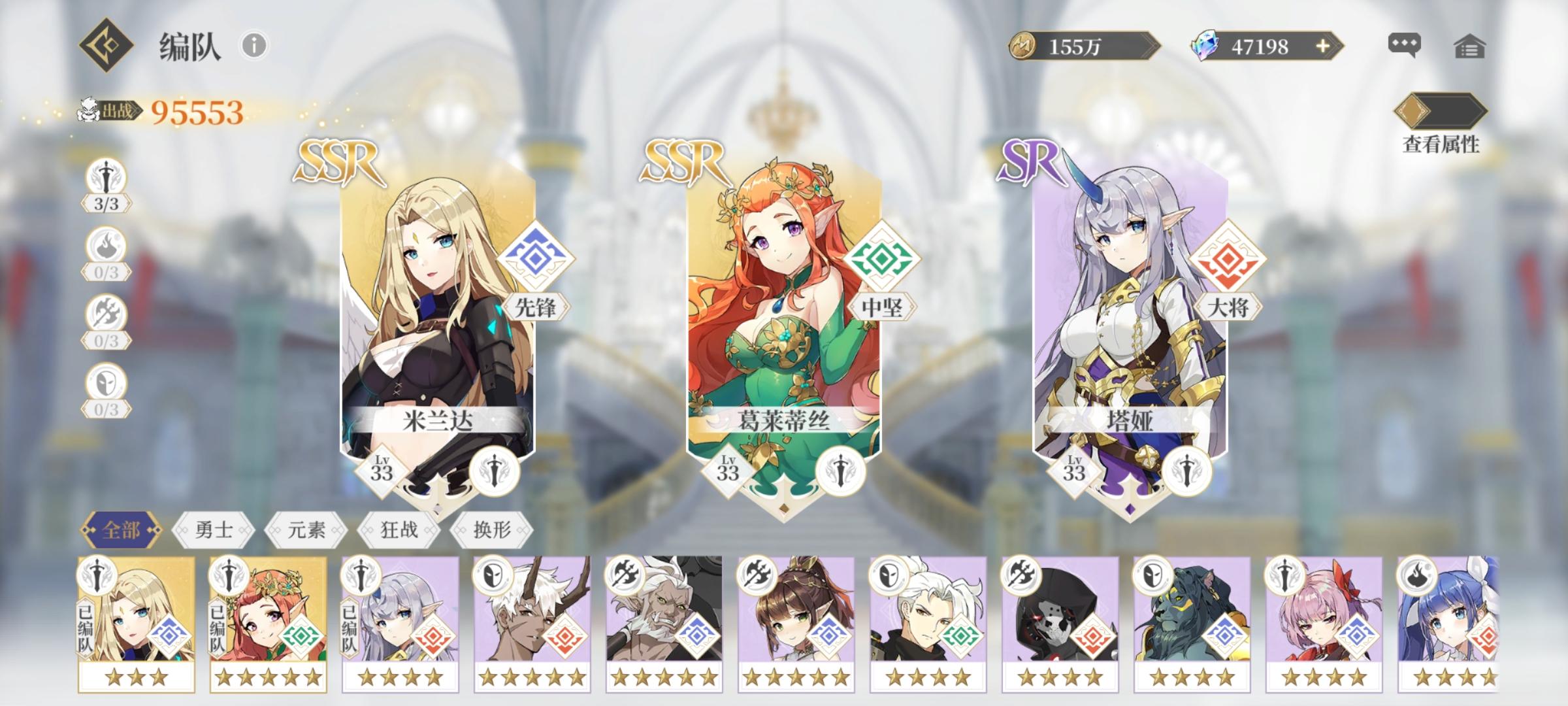 首充党,目前差一个ssr全图鉴但是幸运的是我幻形队两个ssr都三了我建议开局好兄弟们抽完角色最好有一套幻形和一套元素(别喷我,我慢慢讲原因)因为这两队真的是两个极端一个推副本强的一批一个打塔猛的一批现在讲一下幻形的注意事项因为我开局纳塔娜三星所以就没带米兰达这边提一下在阿德琳没有三星的时候我建议就带泰雷(这个时候我就想吐槽一下了,为什么我泰雷才刚刚三星)所以我们的角色就是纳塔娜,