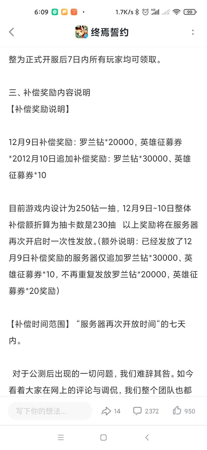 这次原罪就是那20000+20的公告,你要是觉得只能发这么多,请在到上限时出来讲清楚,而不是在这里等到自己付不起然后降补偿。再退一步哪怕那条公告写的是“因为不可抗力还续继续维护,我们决定一次性补偿36000+20”也不会被骂成这样,现在是骂名背了,补偿还更多了,真就是离谱