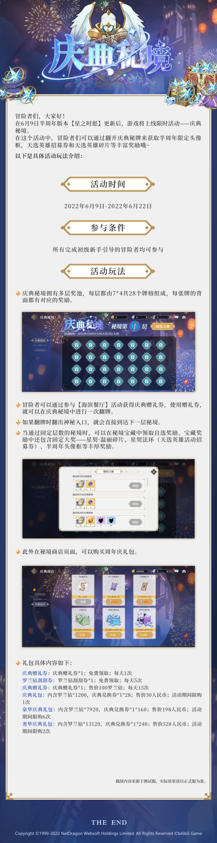 冒险者们,大家好。在6月9日的版本更新之后,《终焉誓约》首位天选英雄-星契·温丽将正式来到艾恩大陆,与各位冒险者们见面啦。同时限时活动“星之时愿”也将同步开启!活动期间,冒险者将探寻温丽在经历变故之后是如何重新振作,开始探索时空魔法的故事。同时可以参与英雄试炼、梦境挑战,使用系统固定的队伍攻略关卡,获得奖励。下面让我们一起来看看活动详情吧~- 活动概述 -活动时间:2022年6月9日——