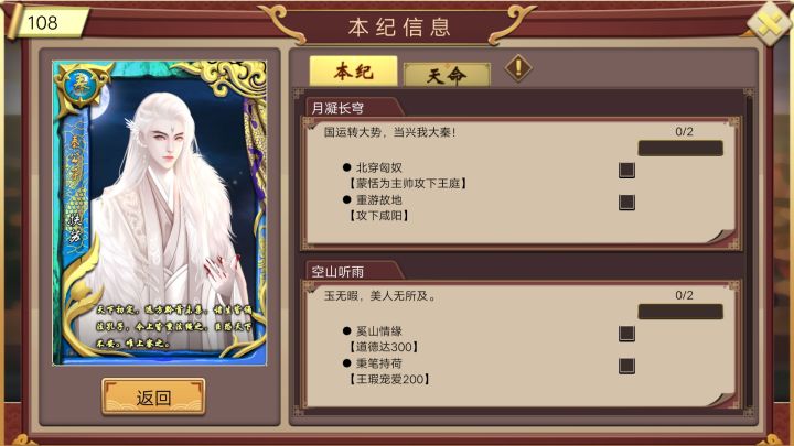 作为一位具有闲情雅致的后宫玩家,扶苏的技能很是友好,就是不知道天命什么时候出来(期待ing),闲话不多说,直接进入正题:如何速刷扶苏本纪。扶苏本纪分两类:一种是战争类,一种是亲密类。玩扶苏最麻烦的一点就是很!缺!钱!开局只有一个城,还是负收入,虽然自带30w蒙家军,但周边国家也都是三级兵种,靠这点家底打天下不现实。那么我就先说说我的攻略思路。开局臣卡必带长策宇内(本纪需要),妃卡随意,策卡要用