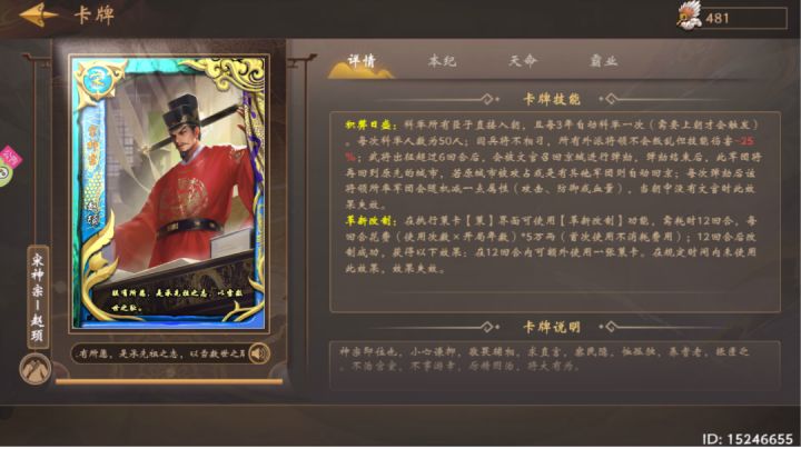 前言:宋神宗这张卡,对于全卡的人来说,都是小意思,对于卡不全的萌新来说,就有点难搞帝卡级别:蓝卡本纪臣卡:不需要,但是可以带新旧党争【新】(老卡,完美适应宋神宗)本纪妃卡:不需要(可以带签到赠送卡宵庆夷愉)高配玩法:天命至现、分封制、千变神机、三顾茅庐低配玩法:入阵曲、刑徒充军核心策卡:熙宁变法全套策卡(共十张)本纪思路:宋神宗主要就是把熙宁变法所有的策卡使用完成,基本属于萌新教学,