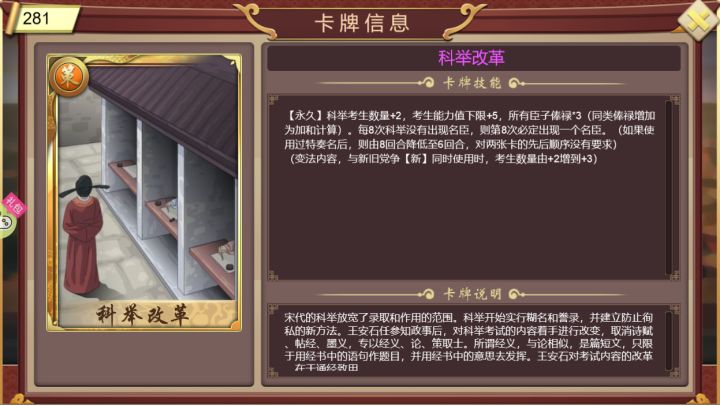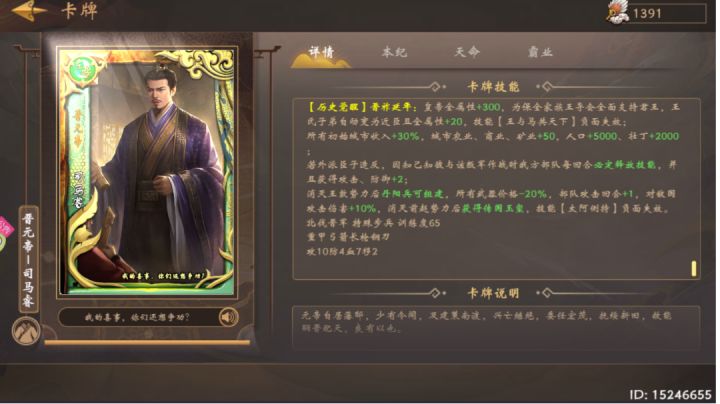 帝卡级别:白卡本纪臣卡:不需要本纪妃卡:不需要自定义人物佩戴技能:农商矿每回合+2、储秀阁推荐人数+3、全属性每回合+5高配策卡:五月端阳、阅兵戌国、天命至现核心策卡:魏晋风流、养鹰飏去、君子六艺、百家争鸣(选阴阳家)、软饭三件套(夭桃秾李、烽火戏诸侯、兄友弟恭)本纪思路及难点:开局民心只有20,城池较多,初始经济很给力,但是用不了多久就会全部叛乱。在没摸清楚该怎么玩的时候,会导致崩溃