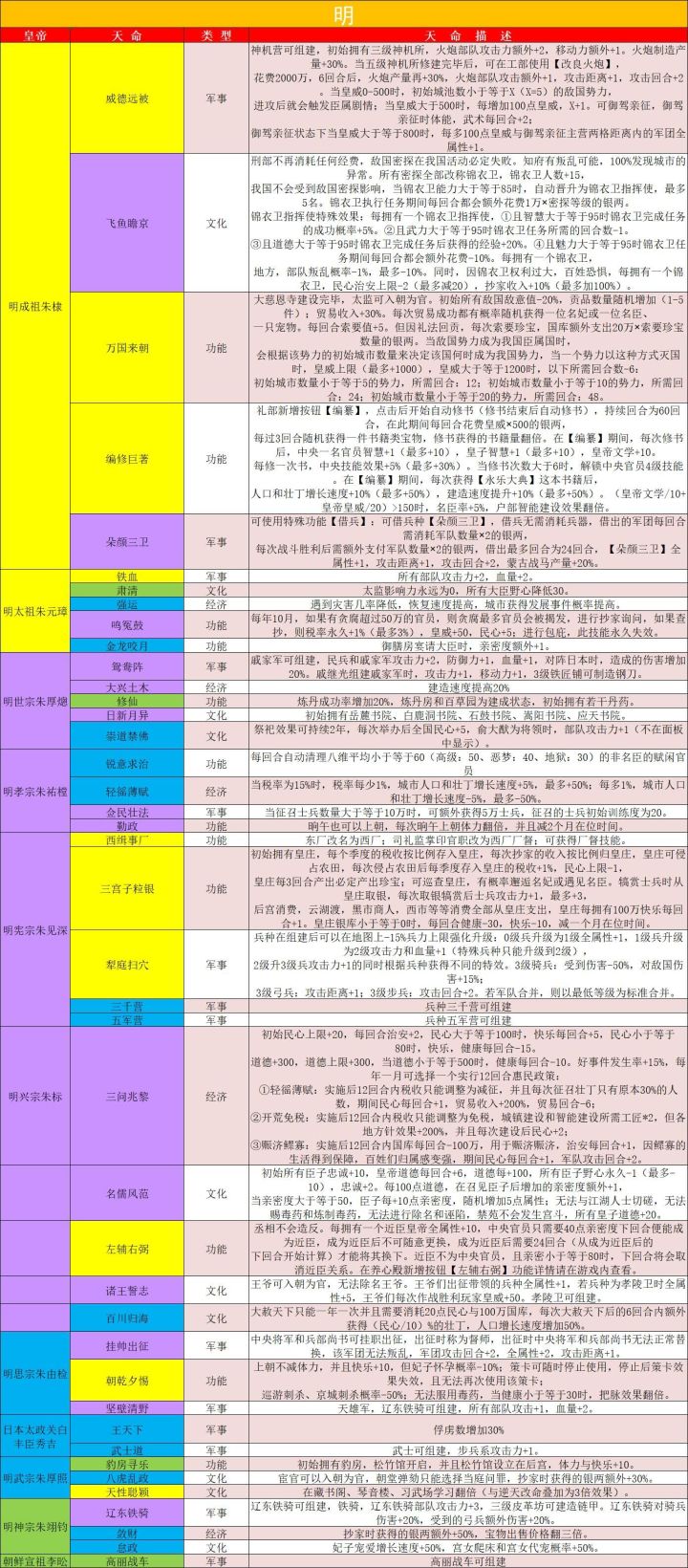 天命搭配1,题字赋诗(文化)清高宗在典故中开场会清0文学武术才艺皇威(优先最高)所以要和文渊参事绑文学,可以在开局进入吏部2,固国安邦(功能)汉高后吕氏进入吏部但主要职位不能安排,董卓是丞相是不可以用国策,所以要用(孰可代者)全换了(这个时间很紧张,韬晦之计一定要用,必须献祭名臣)3,建文新政(功能)建文帝全减掉,1好让黄袍加身的太后放弃垂帘听政。户部民心85才能赶走所以该巡逻的