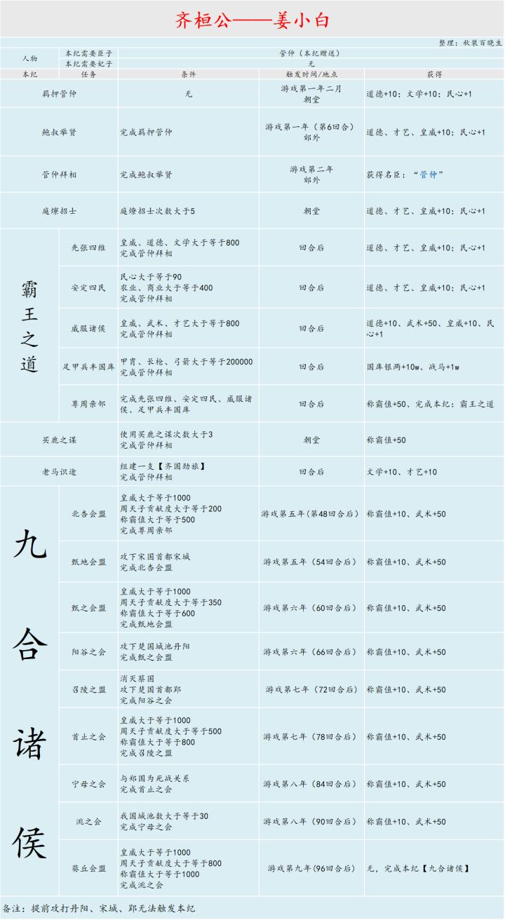 大家好,我是秋装百晓生,我为大家带来的是全帝卡过本纪的时候需要注意的地方,希望对大家有所帮助。喜欢请点赞,收藏,分享哦,你的支持是我更新的最大动力首先登场的是春秋部分:齐桓公——姜小白晋文公——姬重耳越王——勾践吴王——阖闾 楚庄王——熊旅郑庄公——姬寤生秦穆公——赵任好宋襄公——子兹甫其他的朝代帝卡本纪图,我会陆续发在下面的楼层的。#攻略#游戏安利#单机游戏#游戏讨论