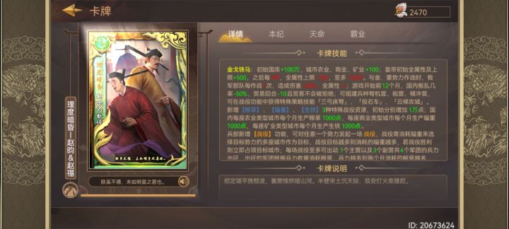 皇帝卡说实话,新手最适合入的那绝对是宋太祖。他有个很bug的东西叫赋税专收,就是你每三个月可以收两次税。对于新手这种没什么经验,打不明白开局就要被打灭国的那种。这张卡极其适合入手。就算不会玩,有钱随便建个民兵队守住度过前期就行。可以说是平民玩家。新手很推荐入手的一款卡了。