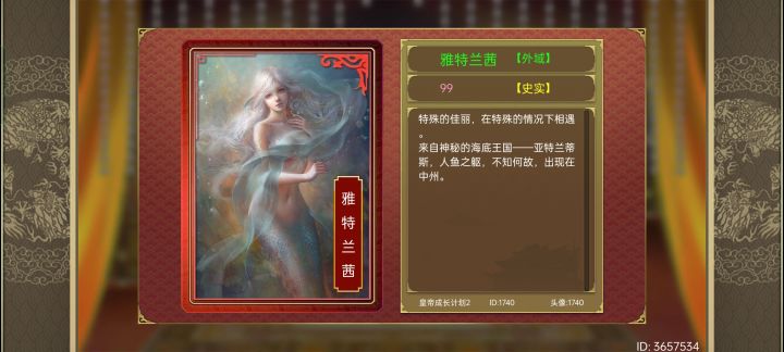 第一年三月,去西市见马秀英,出脚绊倒,回信,获得鲛人泪。接下来就是刷属性,道德>400,才艺>200,皇威>300。满足条件后,随便哪年3月傍晚去郊外。3月夜晚,郊外,对话???,说出愿望,见到鲛人,女鲛人。获得亚特兰茜vx,去禁苑内务回信,有何顾虑,也不是不行。6月,朕一定,疑人不用。7月,云湖渡,上船,闭眼放松,不生气理解9月,生活,傻姑娘啊,高兴11月,遗憾,今天有事吗12月,