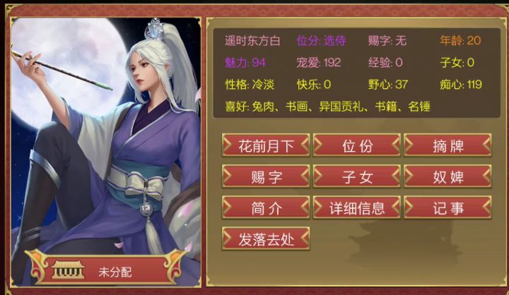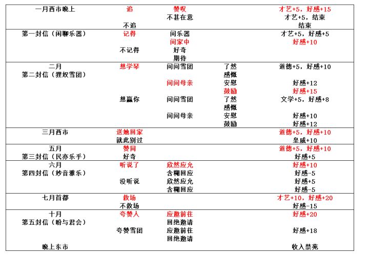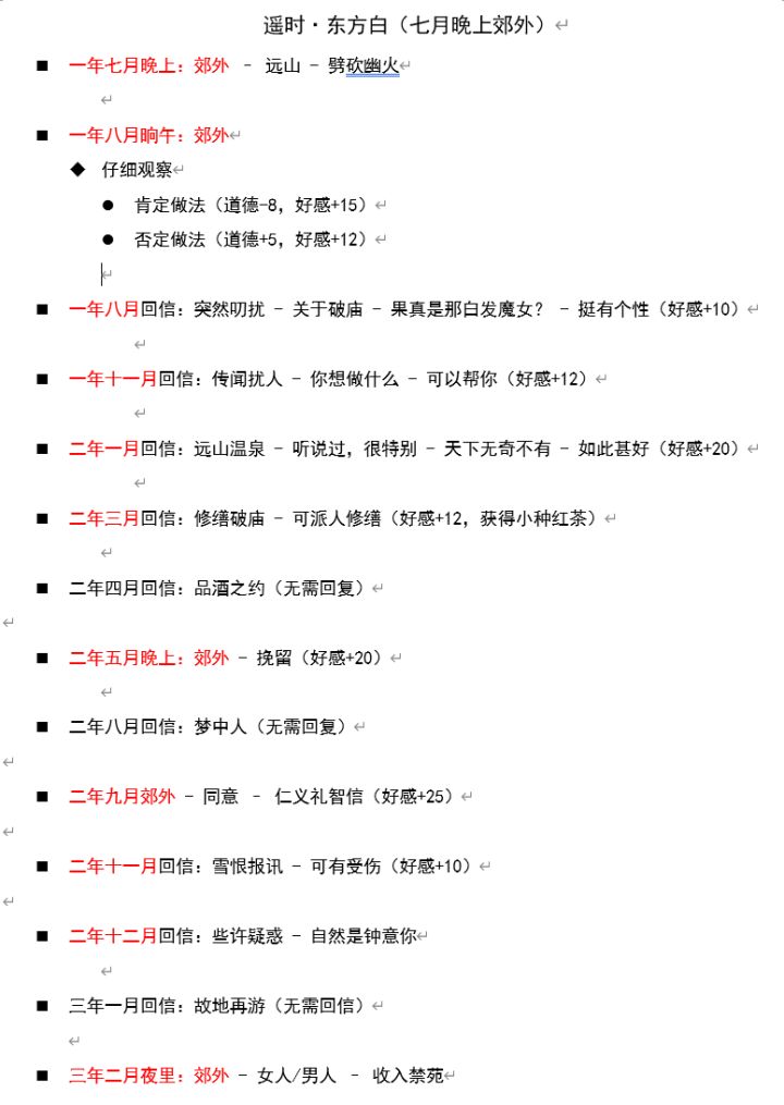 提供一下选项,具体需要的属性数值不太清楚,没有开新档刷遥时·东方白(七月晚上郊外) 一年七月晚上:郊外 – 远山 - 劈砍幽火 一年八月晌午:郊外 - 仔细观察 肯定做法(道德-8,好感+15) 否定做法(道德+5,好感+12) 一年八月回信:突然叨扰 - 关于破庙 - 果真是那白发魔女? - 挺有个性(好感+10) 一年十一月回信:传闻扰人 - 你想做什么 - 可以帮你