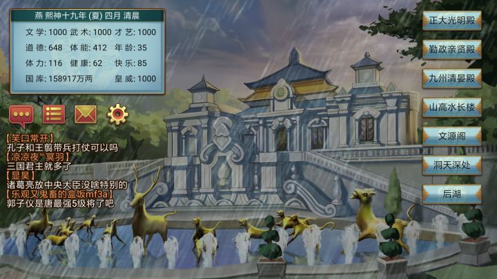 建好圆明园,颐和园等园林后,在养心殿去出游,本以为是随机来点属性就结束一个时间段的效果,谁知道竟然换背景了。。。。。😂😂😂😂😂不过还蛮好看的(紫禁城看腻了)