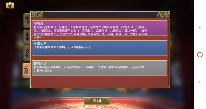 汉献帝刘协:黄巾之乱:初始国库-100w,人口-50w,税率-2%,民心-20。大汉正统:名臣概率+3%,地方前四年地方不会叛乱,四年后皇威大于600时地方不会叛乱,皇威小于400时每小100叛乱几率+1%,帝党官员亲密度达一百直接成为近臣。卖官鬻爵:所有官员属性-5,珍宝阁初始拥有大量宝物傀儡皇帝:初始年龄为14,上朝后不可以进行调换官员以及使用国策初始皇威为0,东厂势力为帝党,相党,中