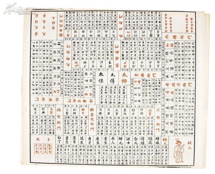 和游戏群里大佬讨论了一下,觉得很有收获,因此逾越一下借花献佛。这是古代的一种桌游玩法,升官图游戏,类似于飞行棋的前身,堪称老北京版大富翁。左下角是起手,会有一个上面写了{德,才,赃,功}的陀螺用来充当类似于骰子的物品,抽到赃就会退后,抽到德会前进。退后和前进就是官职品级的升降,游戏中升官可以得很多钱,才和功不是很清楚,应该也是略微上升。不过这游戏比飞行棋复杂,里面的官职错综复杂,分划细致,最高