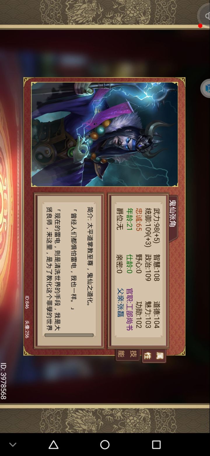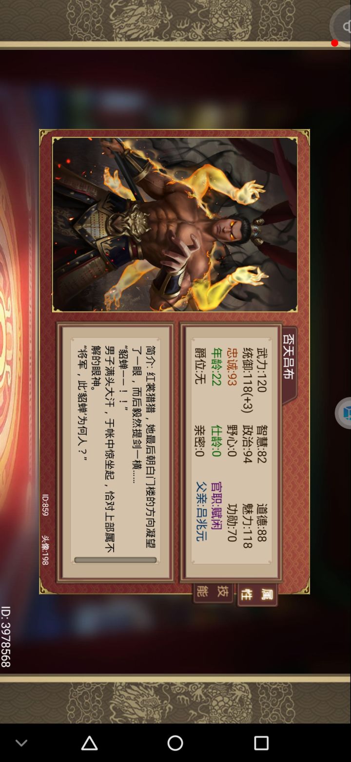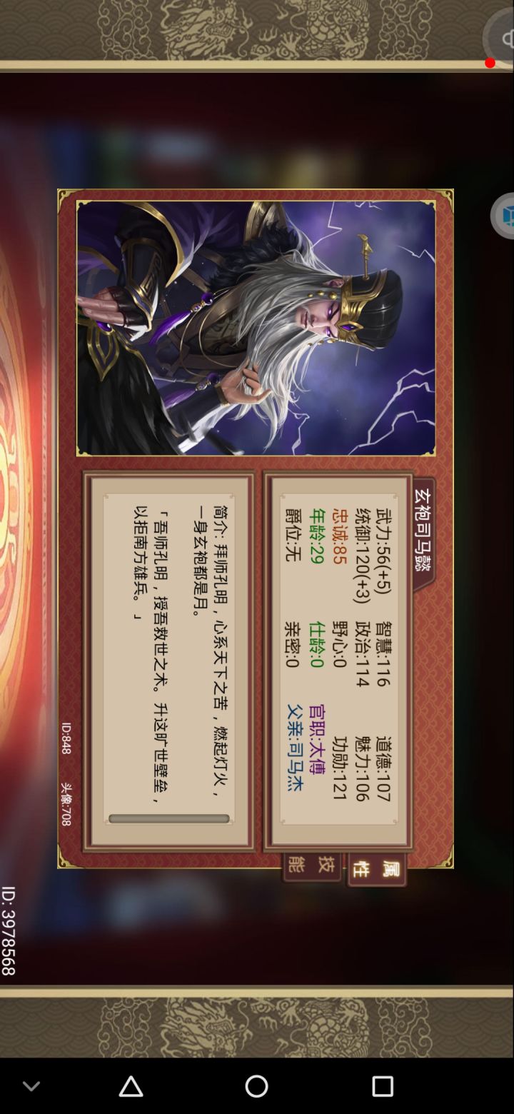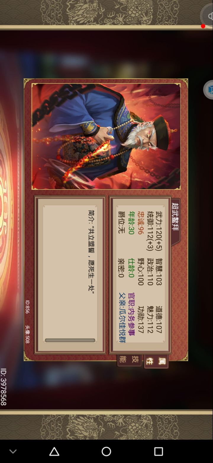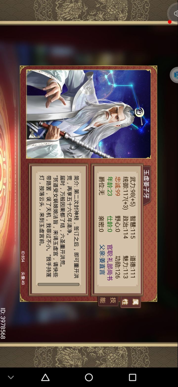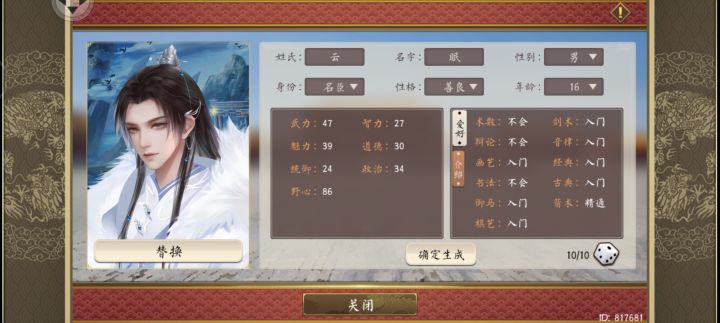 总体还是挺喜欢的,但是我不喜欢他80+的野心,既然有加野心的宝物,是不是该有减野心的宝物?或者骰子每天刷新?培养的话…真能吞谋略呀😂养成一个人物后得缓缓立绘和简介生成后是可以修改的,不过简介有次数限制。可以佩戴技能真的太可了,快多出点墨宝呀,比如每回合-5暴虐啦,每回合-2野心啦,每回合+15体力什么的嘿嘿…当然更强力点更好,那样可以省下不少天命点带其他天命了之后开游戏就可以看见自定义人物啦