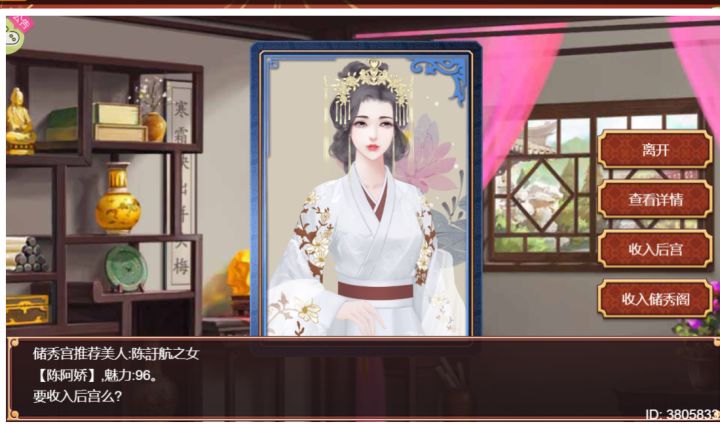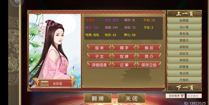 开局忘带金屋藏娇了,想着多sl几下问题也不大,tmd从25岁一直找到44岁。下一个来的名妃就是晋朝的了,刷吐了。还有,云渡湖有点儿问题,会出现男宠的名字(李延年,冯子都,董偃等等),招来之后,却又是其他什么奇怪的人了。