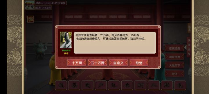 玩地狱难度作死,一刷6年60万一级骑兵打32万一级叛军打不过。然后就放弃了。二刷,二年底收入在400万左右,贸易收入在130万左右,工匠42万,还得赈灾等其余繁琐事件,一年估计亏200万。年底给我来了个惊喜第一个文渊参事抄家50万,内务参事也50万(同月)。当时我想着随从是个好东西,然后又调查文渊参事一波,结果又赚了100万。这个故事告诉我们没钱就去抢文渊参事和内务参事,反正那俩人总是富得流