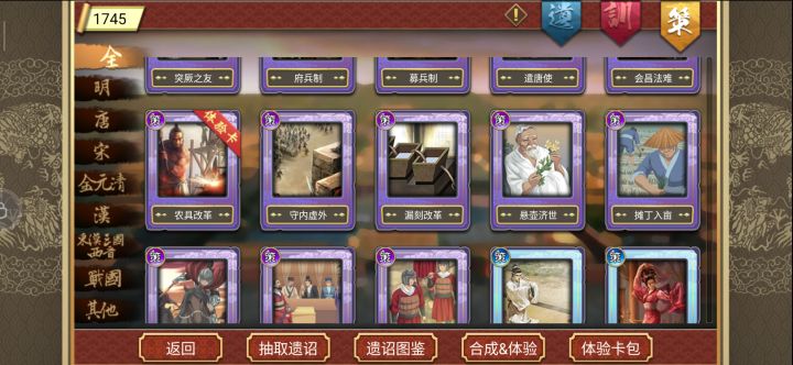 上次更新后,档位互通推出,那么可以发现游戏的一个[特性]😂,开几个档就可以深夜反复sl刷卡牌啦!基本可以确定普通的物品和臣子堆叠上限是5个,帝王的爆率太低弄一个就懒得刷了,而且貌似几个档同时存在后因为卡片同步的影响,合成后卡牌无损。而经过几个小时的不懈努力,终于把六国君主的卡都爆出来了✌🏻,特此纪念。本来懒得做本纪的,奈何谋略最近回收太猛了,加上它太香了,相当于直接送两个帝王的核心技能。