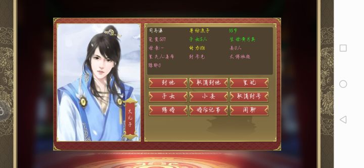 就是第一代没有任何天赋,然后从第二代开始会随机觉醒天赋(根据属性),第一代退位,躁郁值高于一定的太子会造反,第二代可以跟第三代传输技能(需要太子属性和回合数),第二代退位,第三代躁郁症高于一定数额的人会造反〔大臣会随机献策,不可保留到下一代〕,名臣每10代刷新一次。注:1,皇子觉醒的技能都为自定义已有的天命。2,臣子进献的策卡都为帐号已有的策卡。3,当太子躁郁症高于一定数值的时候(继承造反值