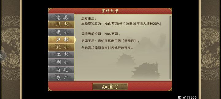 bug反馈:点禁苑内务中的寄雁传书时出现黑屏现象,严重影响了游戏体验!重开好几次了,我的妃子被毁容了,总是不自觉地点了鸿雁传书,浪费了一个多小时的时间!