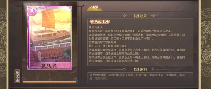 紫策卡段运法bug,第一回合用了这张策卡,在户部进行漕运后,第二回合再上朝,漕运按钮消失了,往后回合也没出现过。