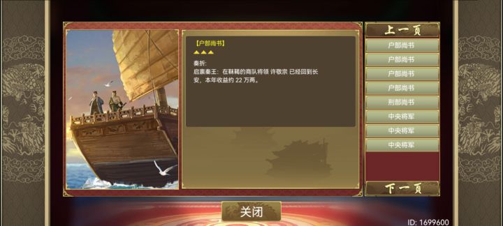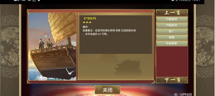 ID1699600 云存档一 李世民大臣贸易成功且盈利后没涨影响力,已经满足贸易且盈利,不论是三月份还是四月都没有涨,那个大臣名字就叫 贸易,是我的自定义大臣,如果自定义大臣不能完成本纪请在策卡里写清楚,是bug就改。 云存档二我拿许敬宗贸易成功且盈利后,还没涨影响力,bug实锤了。前两张图是云存档1的截图后两张是云存档2的