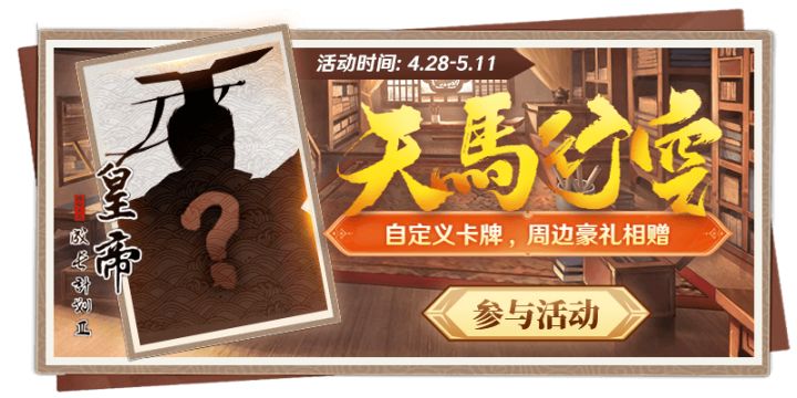 各位老爷好~两位新帝终于在千呼万唤中闪亮登场,不知大家是否已经体验一番了呢?正值五一之际,婉儿祝大人们节日快乐,平安幸福。在此婉儿诚邀各位老爷发挥天马行空的想象力,来设计一下自己心中的那一张卡牌!无论是已有的还是游戏内尚未发布的帝卡,训卡,策卡都可以哦!同时阿恒也给大家准备了小礼物,欢迎各位老爷参加~---------------------------------------------