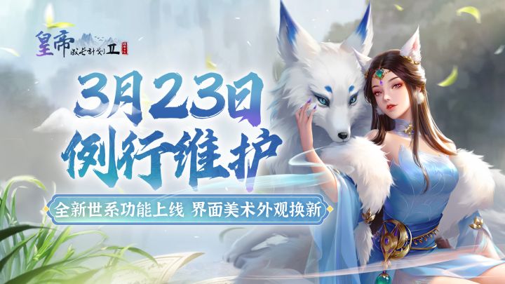 亲爱的各位老爷:莺嘴啄花红溜,燕尾点波绿皱。《皇帝成长计划2》将于3月23日(周四)早上07:00-10:00进行本周的版本更新(期间可正常登录游戏),如有变动一切以游戏内正式公告为准。在此呈上本周的更新公告,请查阅:1、更新——游戏外观更新◆进入游戏界面各大步骤外观更新※ 更新了按钮和各种底图外观※ 优化了各难度的难度详情※ 为优化朝堂稳定&军心内容,系统默认的推荐难度由“中级进士