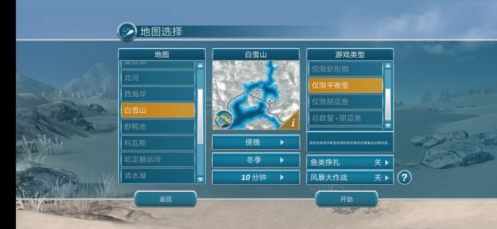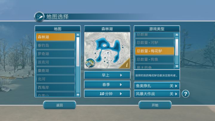 地图:清水湖时间:早上(好上鱼)鱼类挣扎:关(为了能更快的把鱼拽上来)季节:冬季时间:十分钟竞技模式:总重量【装备】重型钓竿+鱼人之友+轻型钻头各位玩过锦标赛的应该都知道,锦标赛时间太长,新手技术不好根本排不上名次,所以时间长奖励低而清水湖鱼大,十分钟一局,最高奖励880还是很爽的,按我的方法排名前三不是问题,别的地图不建议大家尝试,因为前期大家对鱼的习性了解较少,清水湖还是很稳的,