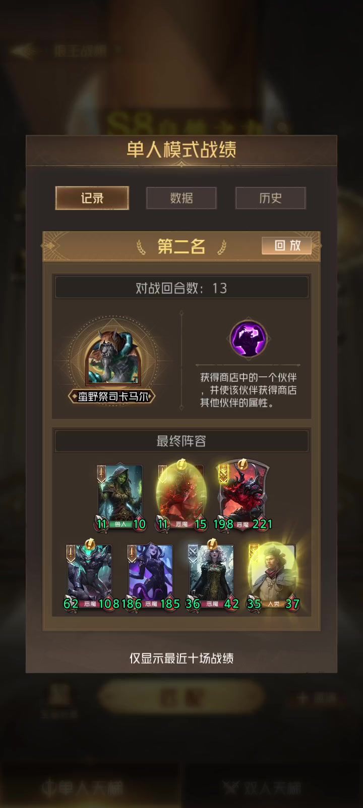 和同一位玩家四局,每次都第二,狼人和魔术师第二正常,苟住混分的。 投机客那局,他是公主,两个人都玩恶魔,前期我凭借经济优势,商店里恶魔所有的组件都被我包了,但公主玩着很顺。 六回合我装备拿壁垒,8回合拿到末日靠壁垒合银,至此我阵容已成,双雕像,白骨,银末日,金噬魂。此后我经济遥遥领先,不停的刷刷刷,却始终不见深渊凝望。最后那个银深渊,还是靠一堆树人团结弄出来的。回头一看,公主都不知道有几个深渊了。