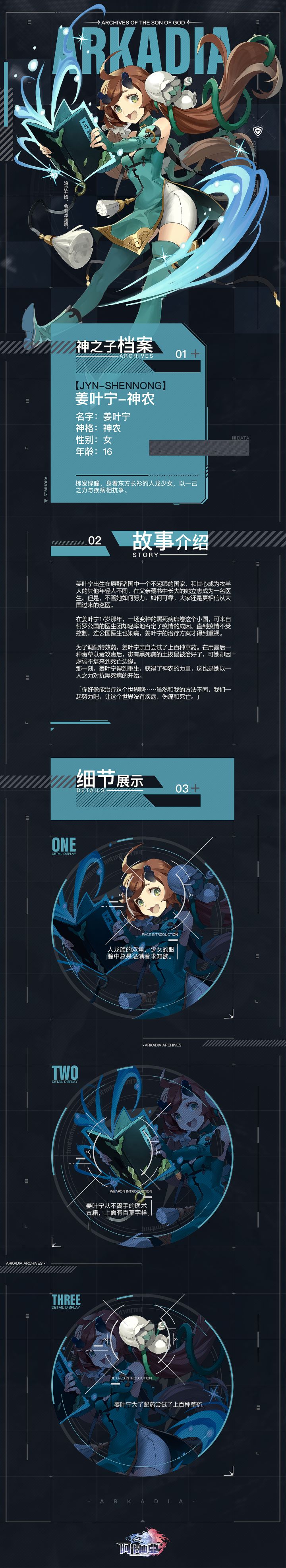 在中国古代神话传说中,神农既为农业之神,也因为神农尝百草这一逸话被尊称为医药之神,是一位古代传说中作出了巨大贡献的人物镜之大陆的姜叶宁是一位从小立志成为一名医生的女孩,为了应对突然袭来的疾病,自己用百草调制特效药,而她也如同传说中的神农一般,亲自用百草试药,也因最后一剂药草而陷入了生死边缘。也许是她的精神感动了神农吧,在那一刻,她获得了神农的力量重生了,并运用新生的力量继续对抗疾病。助理在这
