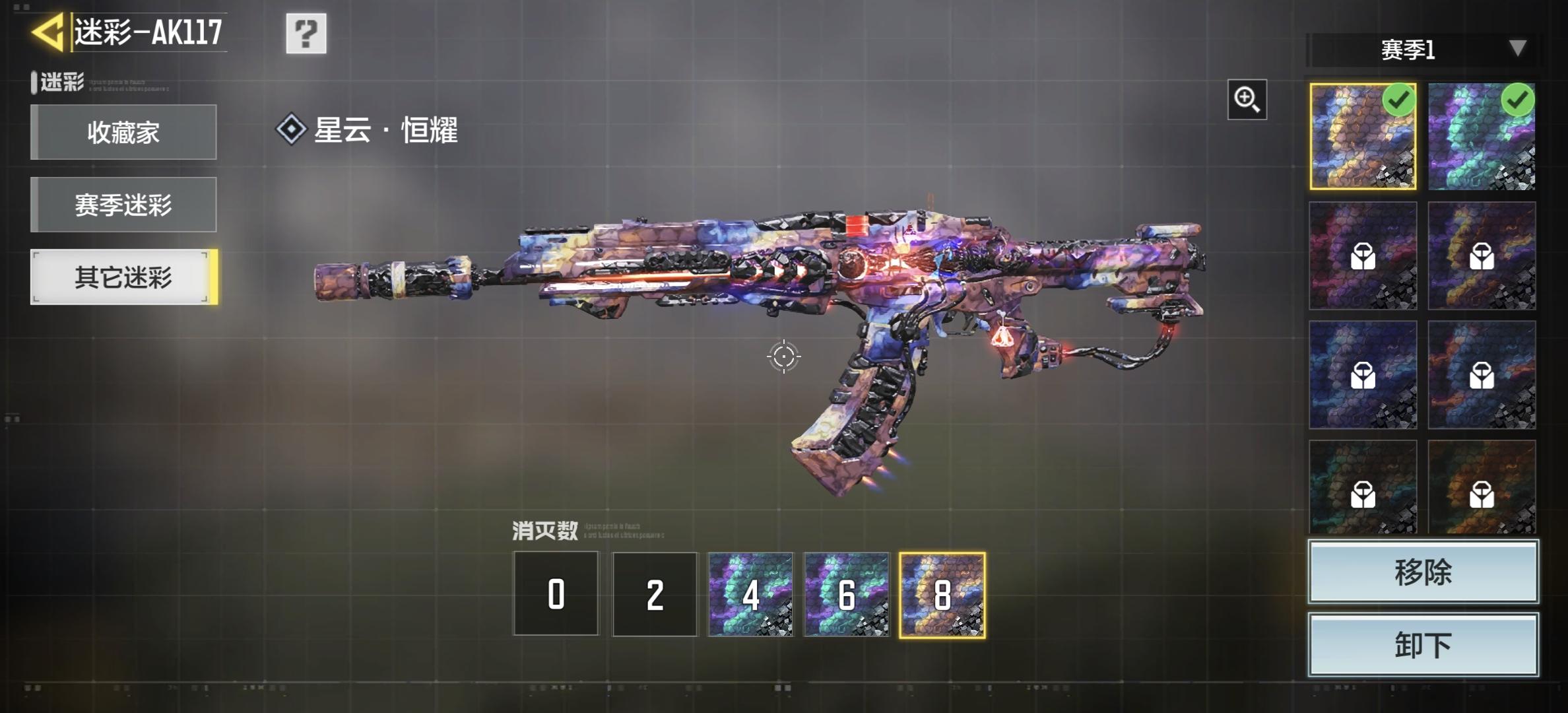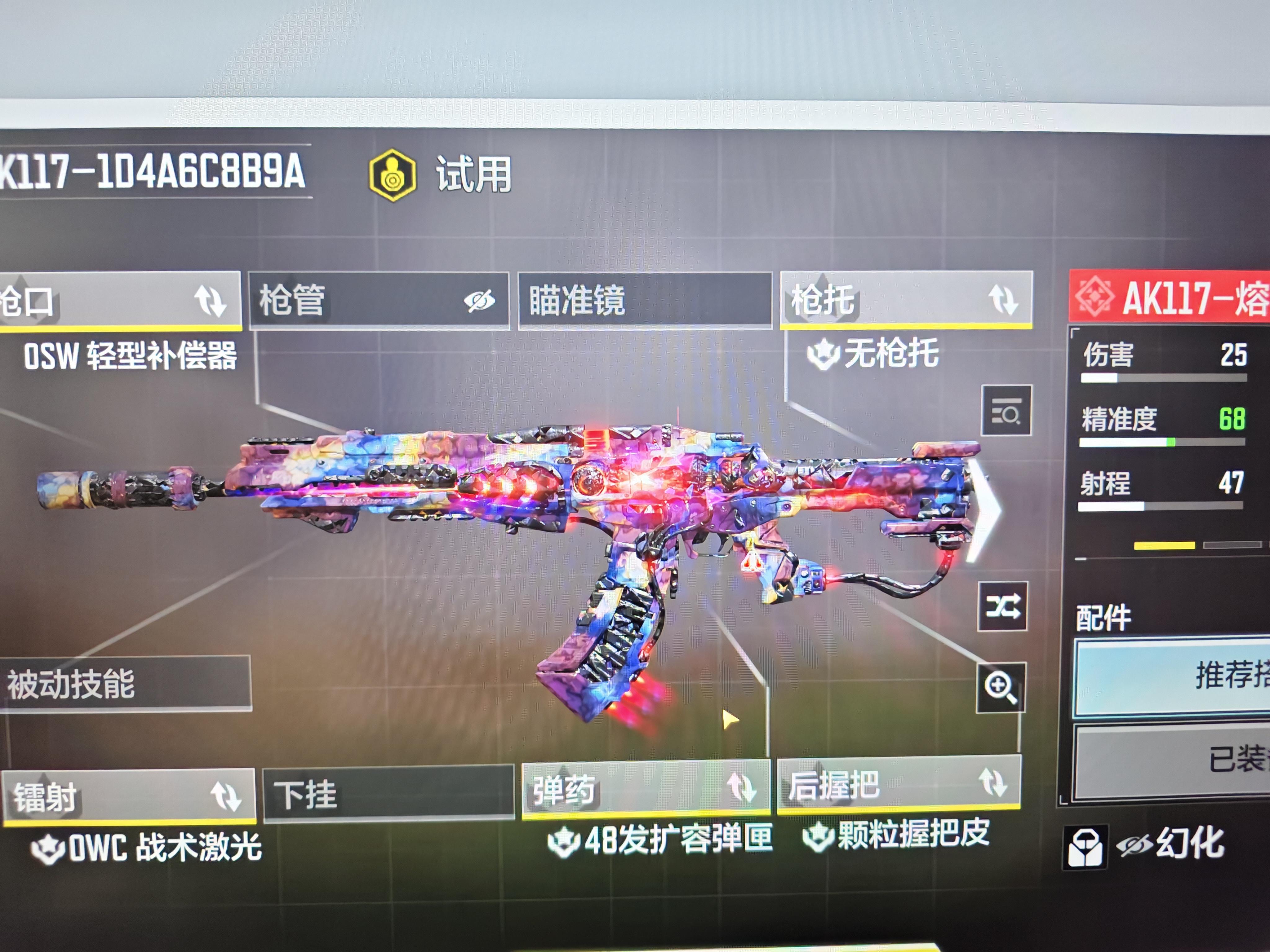 AK117神话皮肤出现大花皮了。图1到图4是腾讯官方的PC端模拟器,结果神话武器大花皮了,这是第一次出现所以肯定不是我手机的问题。图5到图8,手机端开始还正常,后来和PC端一样早于了大花皮。事情的起因,放在最后说,图9是我DIY AK117的皮肤,如图所示消灭敌人达到4到8时,开始根据预设的色彩进行变化,结果就发生了上述的问题,目前还没有测试其他武器是否都如此,只有AK117遇到了这个情况,