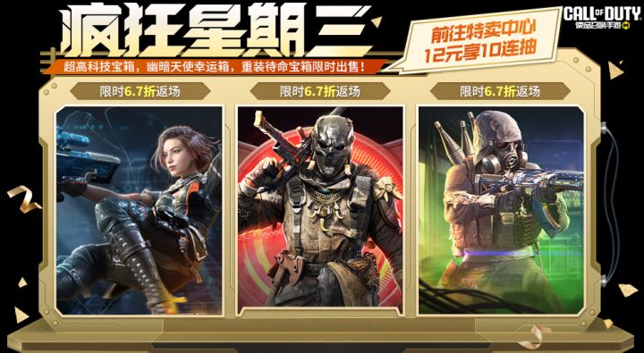 5月7日(本周三),本次疯狂星期三返场的三个高人气宝箱分别是机动部队宝箱、矢量弹出宝箱、智能风暴幸运箱。疯狂星期三活动期间,战士们将享受6.7折的超值福利优惠。本次返场的三个宝箱各拥有一次特惠十连抽体验,战士们前往“特卖中心”,花费12软妹币即可十连抽一次!机动部队宝箱山川原野,静谧无声,潜藏在山林深处的机动部队已经做好战斗准备!这次,为机动部队的战士配备了史诗级武器AGR-机动部队和AK