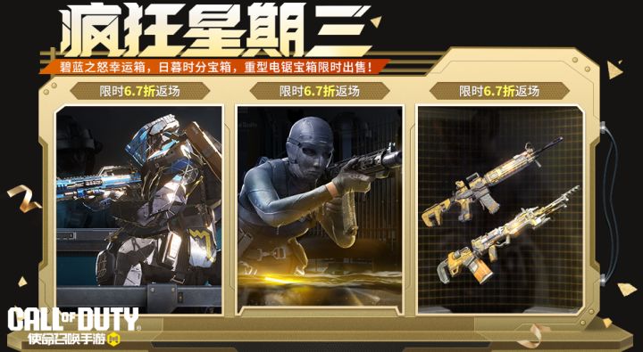 4月30日(本周三),本次疯狂星期三返场的三个高人气宝箱分别是碧蓝之怒幸运箱、日暮时分宝箱、重型电锯宝箱。疯狂星期三活动期间,战士们将享受6.7折的超值福利优惠。本次返场的三个宝箱各拥有一次特惠十连抽体验,战士们前往“特卖中心”,花费12软妹币即可十连抽一次!碧蓝之怒幸运箱当训练有素的战士获得科技加持的机甲,攻防愈发牢不可破!机甲佣兵-碧蓝之怒作为未来科技的产物,降临战场。他的长官已经为他