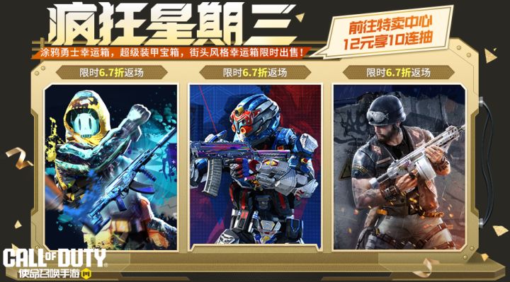 街头的涂鸦看似凌乱实则隐藏着关键信息将它们画在铠甲之上是对自身实力最戏谑的伪装10月15日(本周三),本次疯狂星期三返场的三个高人气宝箱分别是涂鸦勇士幸运箱、超级装甲宝箱、街头风格幸运箱。疯狂星期三活动期间,战士们将享受6.7折的超值福利优惠。本次返场的三个宝箱各拥有一次特惠十连抽体验,战士们前往“特卖中心”,花费12软妹币即可十连抽一次!涂鸦勇士幸运箱涂鸦风格左右时尚,潮流态度燃爆