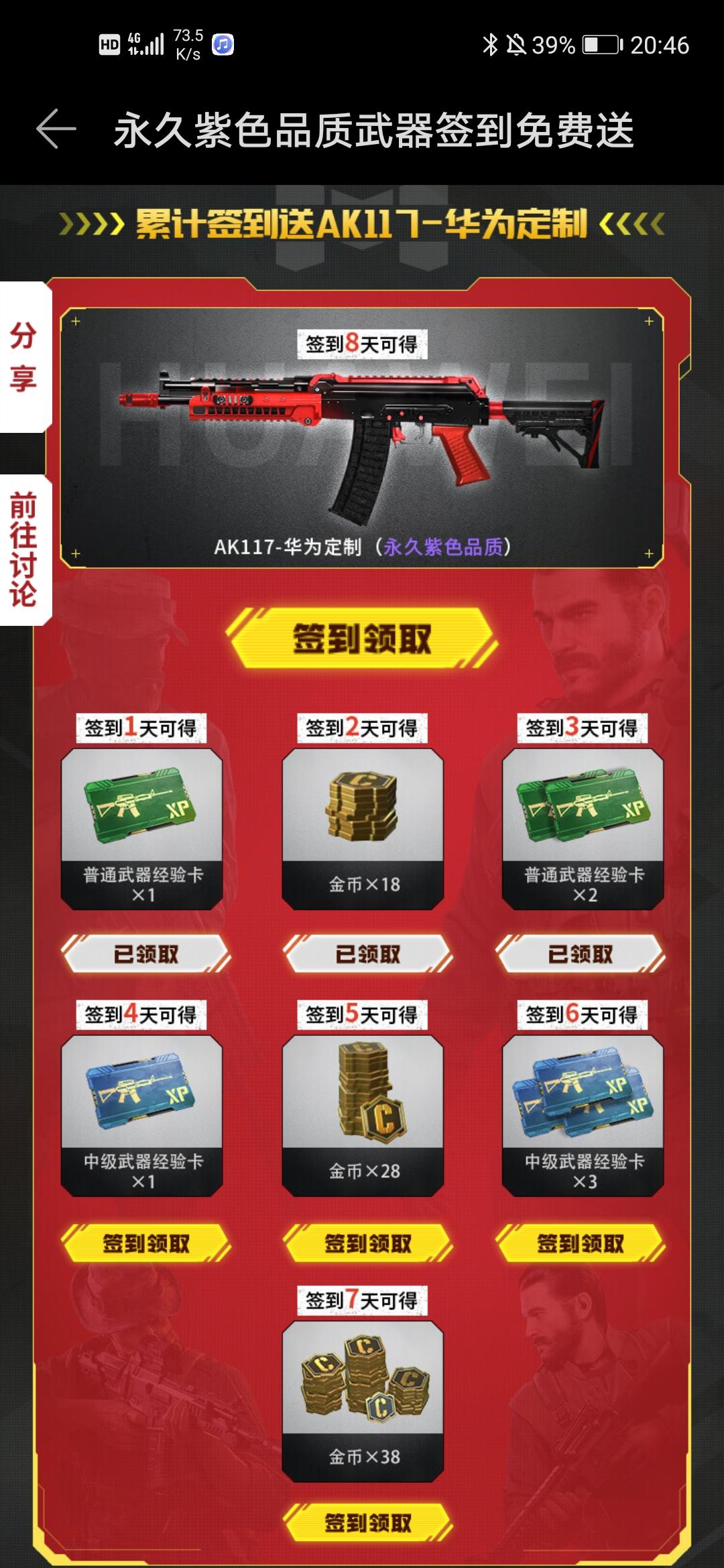 华为游戏中心登陆签到8天即可领取华为定制ak117,当然你运气好也可以直接抽