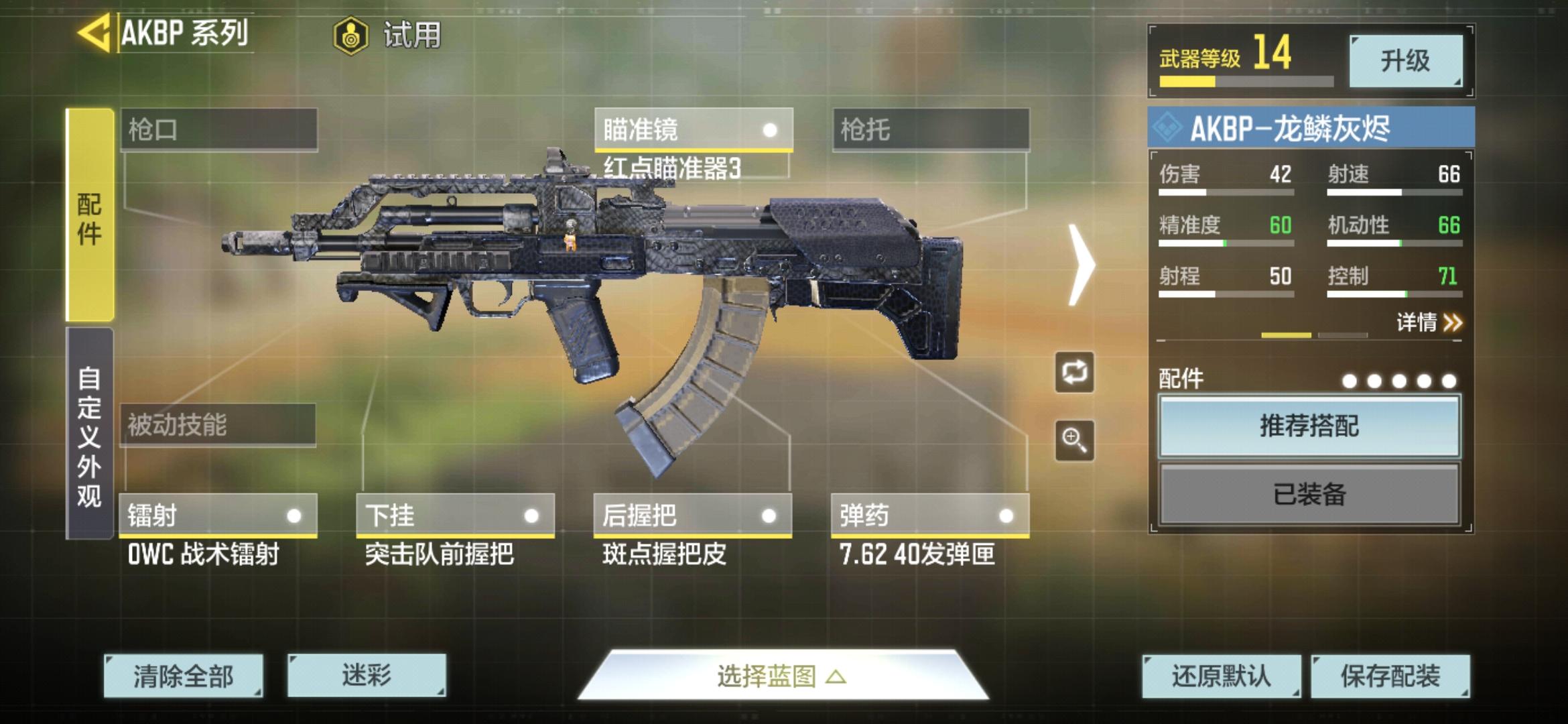 只是为了白嫖taptap的专用枪,不喜勿喷虽然说是这么说,但是确实是一个不错的,适合新手的配装。AKBP是一把不错的新手武器进游戏就有,并且龙鳞灰烬皮肤很容易搞到手,几乎是打完新手教程就可以在活动界面领取,该枪的面板很综合,射速在我看来还是很可观的,所以我很推荐新手用这把枪来打过渡期下面是武器配装,这个配装主要点开镜速度,(虽然开镜速度没有面板参数,但是非常影响手感和战斗力)同时顺带着点了一
