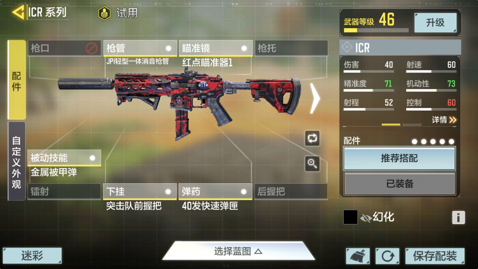 icr这把枪确实很适合新手,这样搭配20米内只要稍微压一下枪,就基本都能打在同一个点上,机动性高,射速快,还稳,换单还快,真的超爱,如果超过20米的话的话就不要扫射了,用小连发。不知道怎么判断米数可以去训练场那里,打那个假人那可以调节米数。没手感的话,也可以用这把枪找找手感好,反正我用起来很爽😗