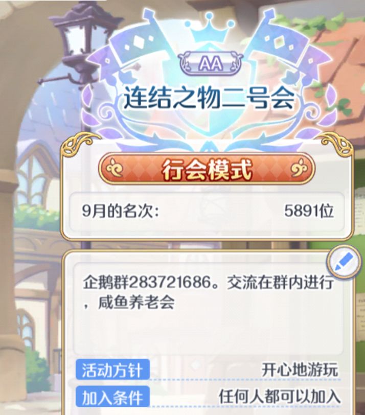 纯摆子公会,会战随便出一刀都可以,公会之前总共9个人出刀都能五千多名,无论是回坑玩家和新手玩家都可以进来快乐摆烂属于一会的养老协会,如果不想摆也想进600名捞更多工资也可以来面试一号会群号283721686会长q690100351