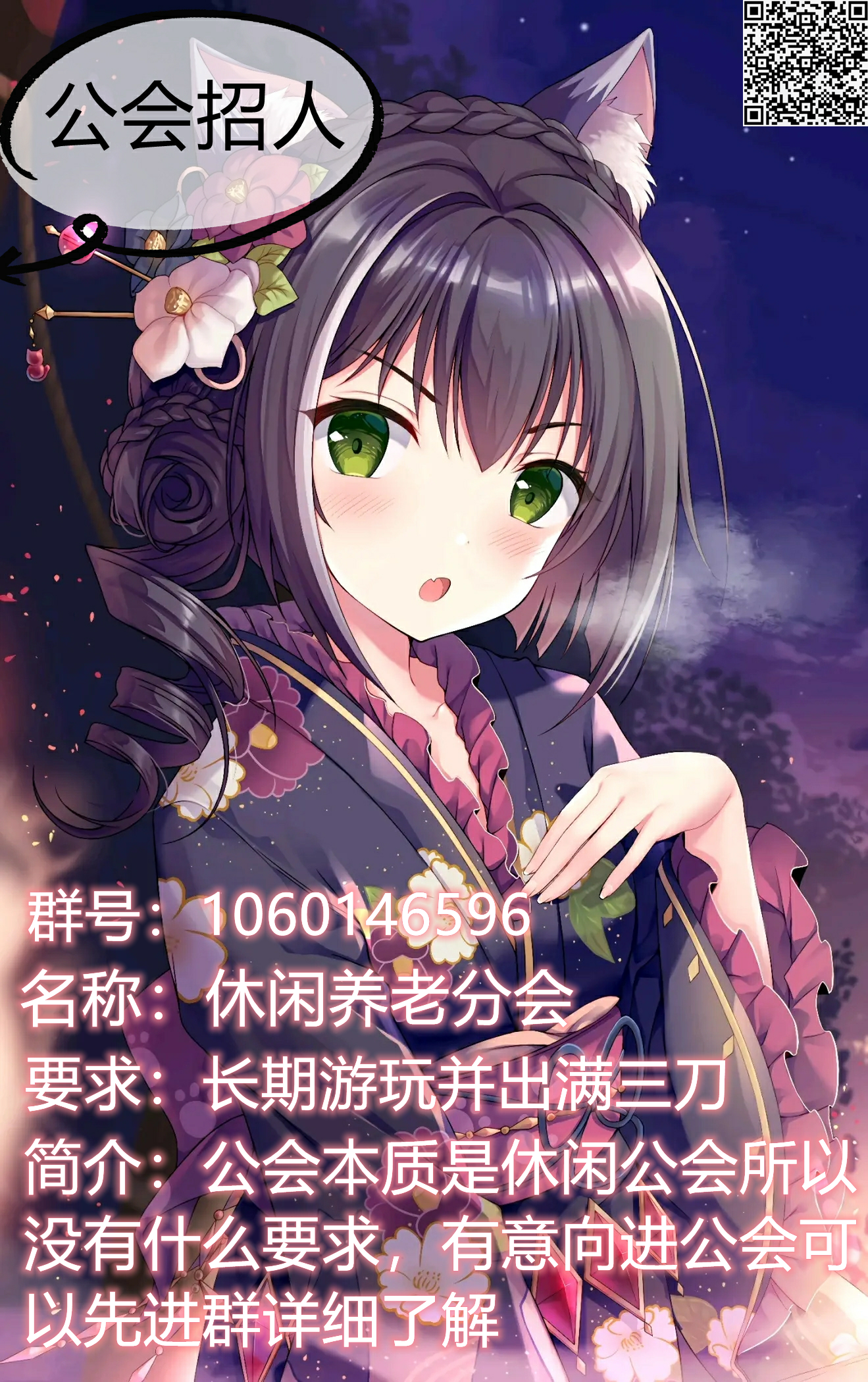鬼灭之刃公会招人啦!(会长:碎翼)排名2200左右的公会,搬运作业加不排刀,每天自由三刀睡饱饱(分不过于拉胯即可),想养老的你还不快来吗?公会成员活跃,有妹子有萝莉有女装大佬陪聊,有垃圾佬有管人痴有老萌二畅所欲言在线解惑,更有定期二次元三次元色图吃🍉供应,老牌公会无内鬼,名额有限🔥🌲入。招收能够长期玩下去的小伙伴加入我们!box可谈,能够长期玩下去可适当降低, 审核及公会群QQ:1102223