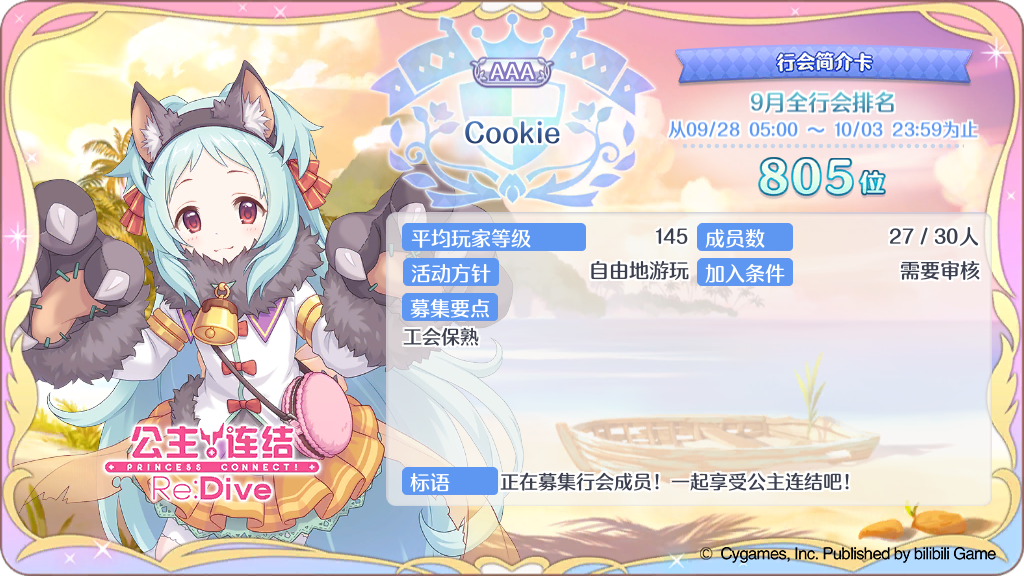 快点入会罢(指新人),我已经等不及了Cookie公会收人了公会目标:我直接进行一个1200的保,上月公会战在800左右,不进行排刀,有轴共享,进群审核。人员要求:出满三刀,c面最好能手动,能够打出与自身相符的伤害,需要报刀,不要求时停刀,一定的活跃度,培养角色与公会战相关者优先。出刀时间基本集中在6点到11点其他情况:本会本质上是个休闲公会,没有太多的条条框框,群内氛围和谐,有大量的电子越共,可以一起玩别的游戏,甚至还能一起打公会战(欢迎各位各位入会群号 167481527