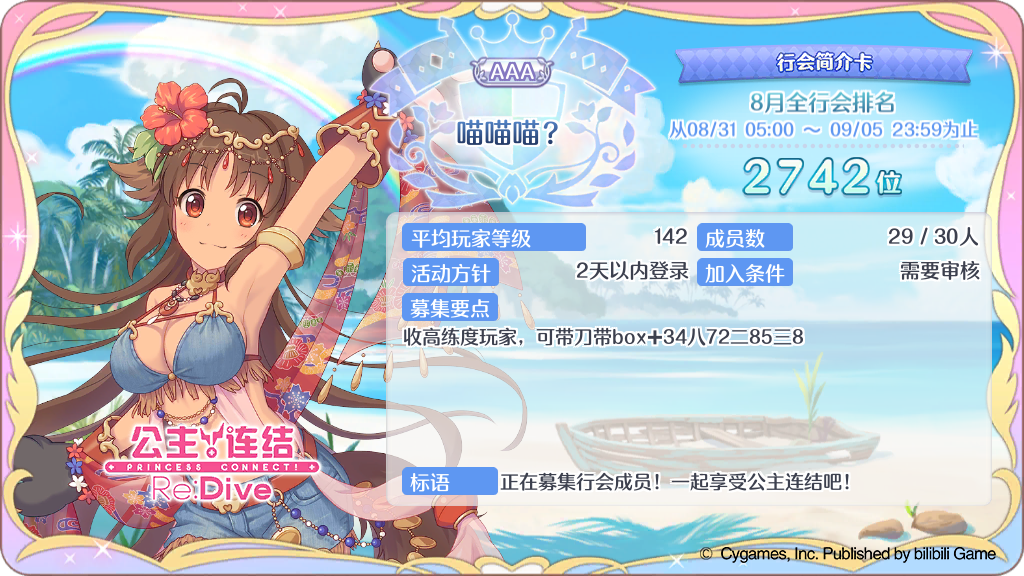 2400名公会收人啦!战力要求90w以上,138级以上, 公会战期间每天出满三刀尽力就好。QQ群:1076520343,群里逗比多氛围好,来了就是好兄弟!讲义气!有吉祥物可供调戏,更有涩图搬运工不定时搬运福利,有意愿的小伙伴赶紧加群一起玩耍吧! 补充:现缺2人!