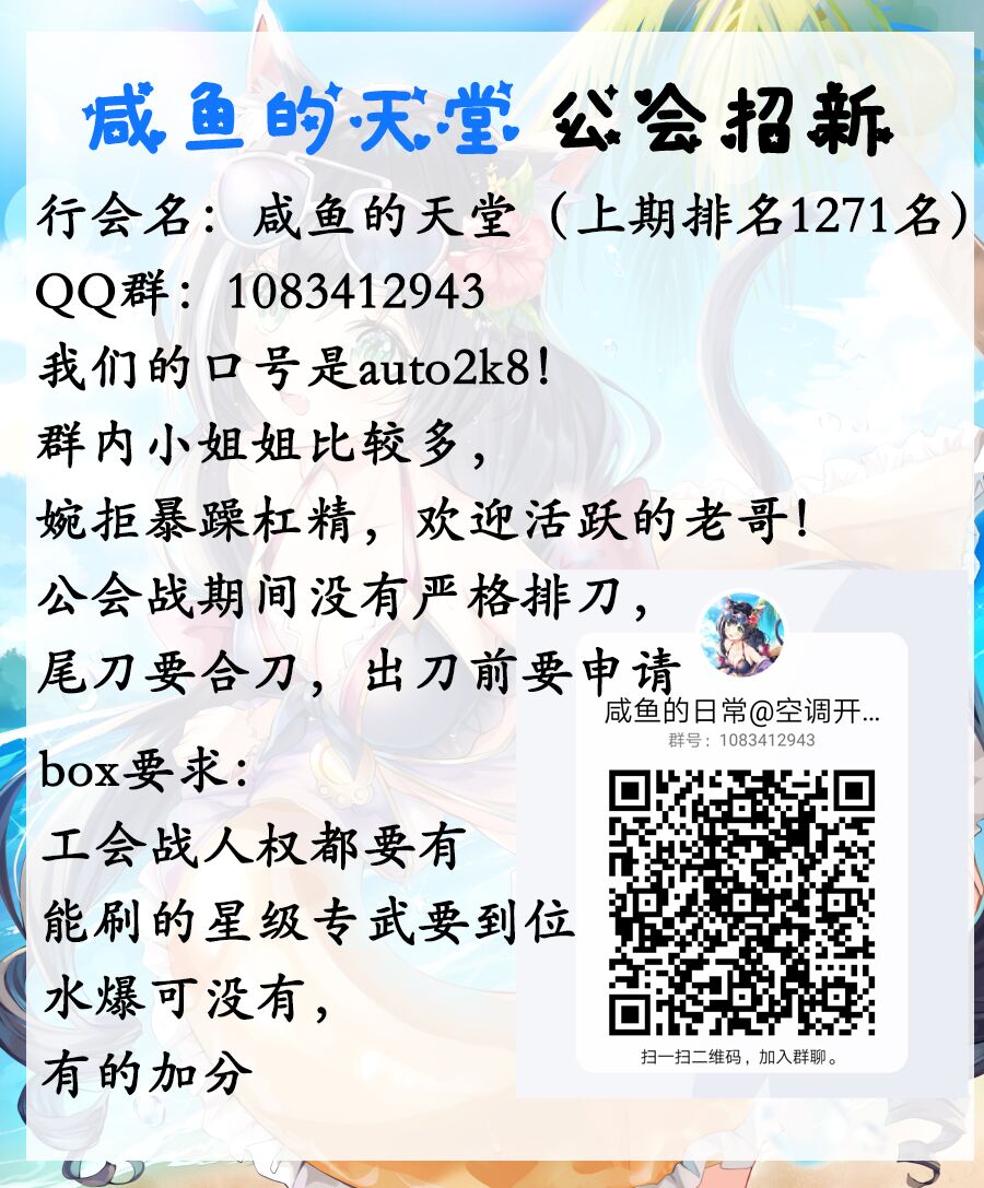 招人啦好兄弟们,本期三千五左右公会跑了一个,招一人。。。要求满级,会战角色基本都有,每日稳定三刀,随便auto。会里氛围很好的,其实主要是想找好兄弟一起打游戏,希望大家能够和谐相处,一起聊天,一起玩得久一点,出刀报刀在群里告诉一声就行了快来群里和小镜华聊天吧qq群:1094438219
