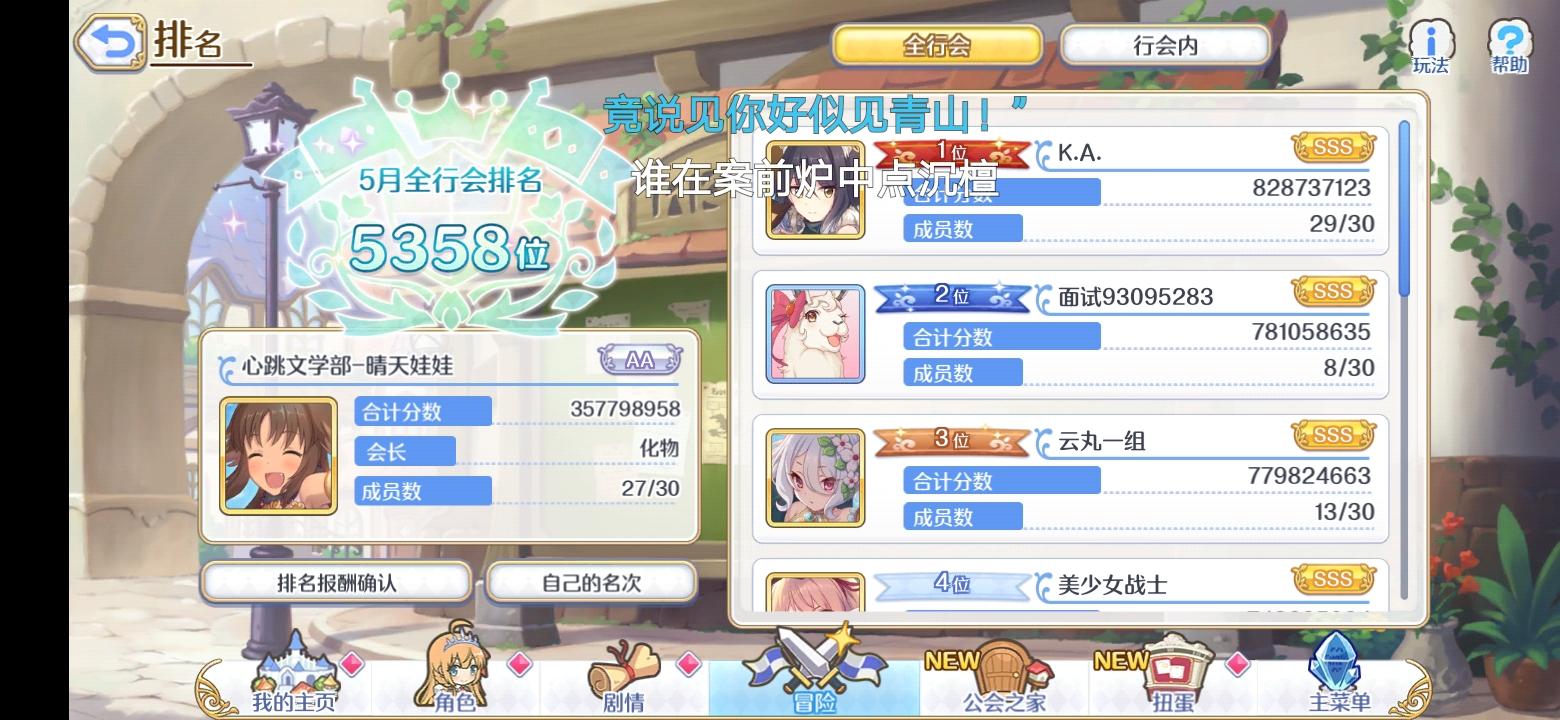 欢迎来我们保2800的公会,公会名:祭位卡池捞月,Q群976820698。公会不排刀,不对轴,全自动(抄作业即可)。上期排名2700左右。