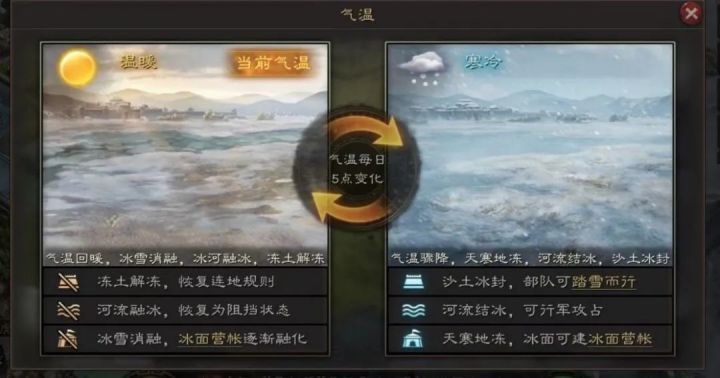 各位主公晚上好!今天带大家了解一下“潼关之战”新元素、新地图、新建筑三大新要素,助力主公们驰骋冰雪疆场!一起看看先锋体验官们带来的消息吧~温馨提示:文末有红包封面!手快有~ 太长不看版1、新元素:潼关之战有冷暖两种气温,对应影响资源州内的沙土/冻土地形;在沙土/冻土区,需占领迁城地基才能迁城。2、新地图:气温寒冷时,沙土变冻土,河流结冰可通行,冰面可快速建营帐,攻防优势可能转换。占领冻土区任