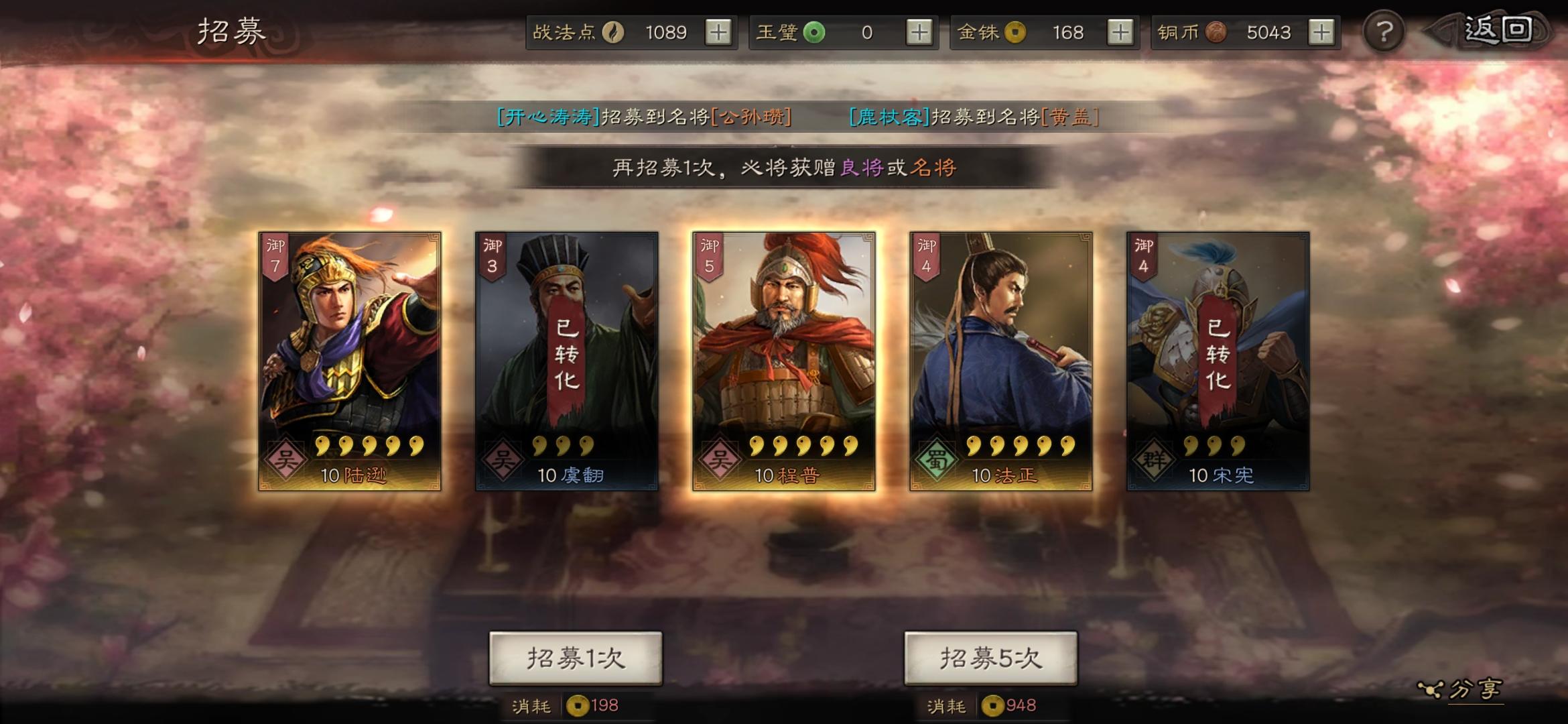 s1充了300左右,抽将36个橙结束。s2开局1万金猪3个武将司马懿,马妹,程普。11月8两次五连徐庶一枚,加油!