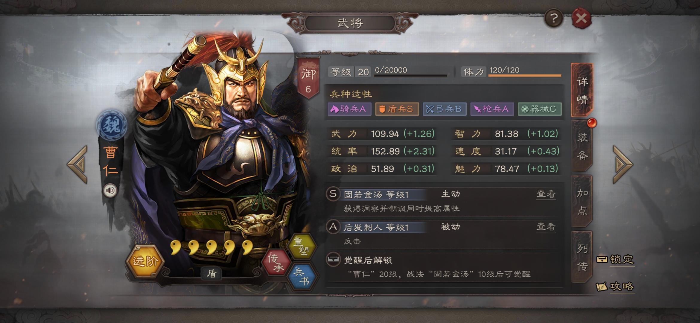 今天免费曹仁半价关羽让我觉得除了登录游戏有点难受(不容易读取设备信息)之外,其他还都不错,哈哈😄曹仁还留着,这个是第二个曹仁,第一个拆阵法了,关羽有一个了,这个再三考虑,拆了战法。我这个人好像有收集癖一样,爱拆战法,不管研究不研究出来,哈哈(ಡωಡ)hiahiahia