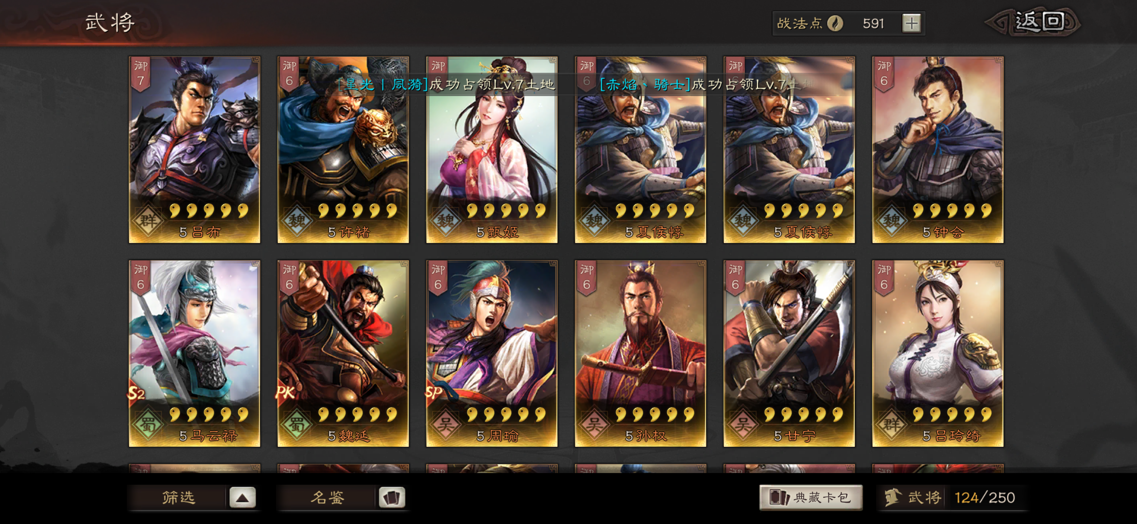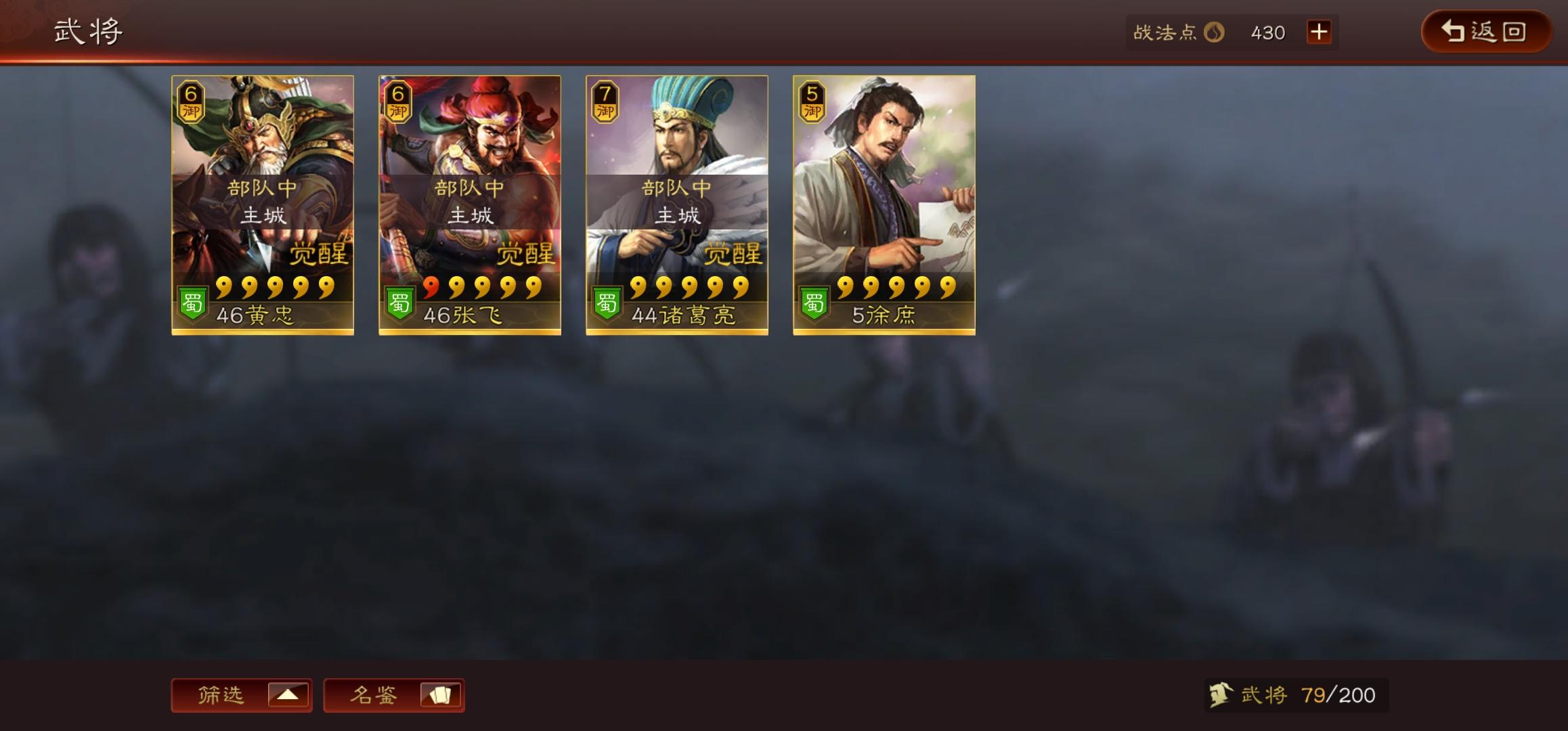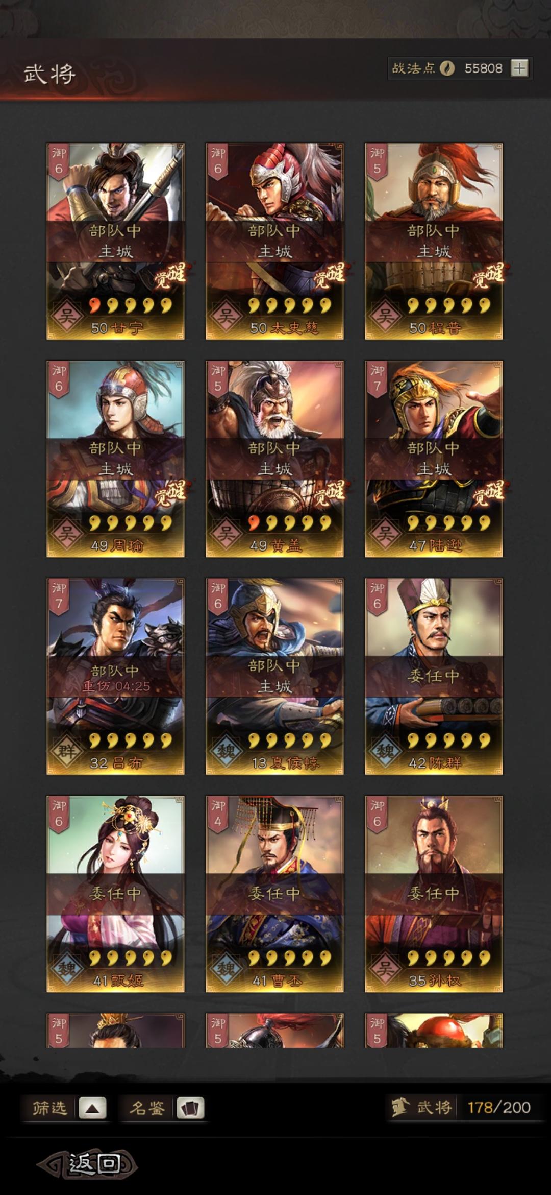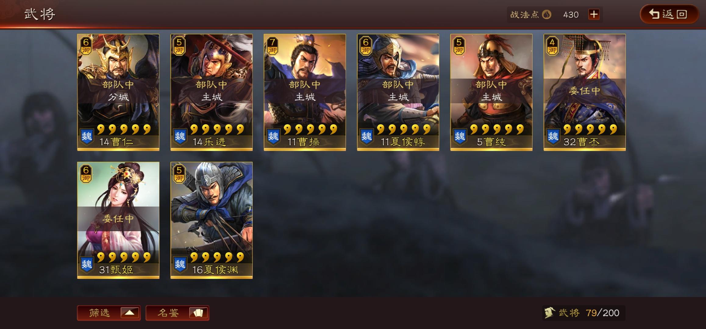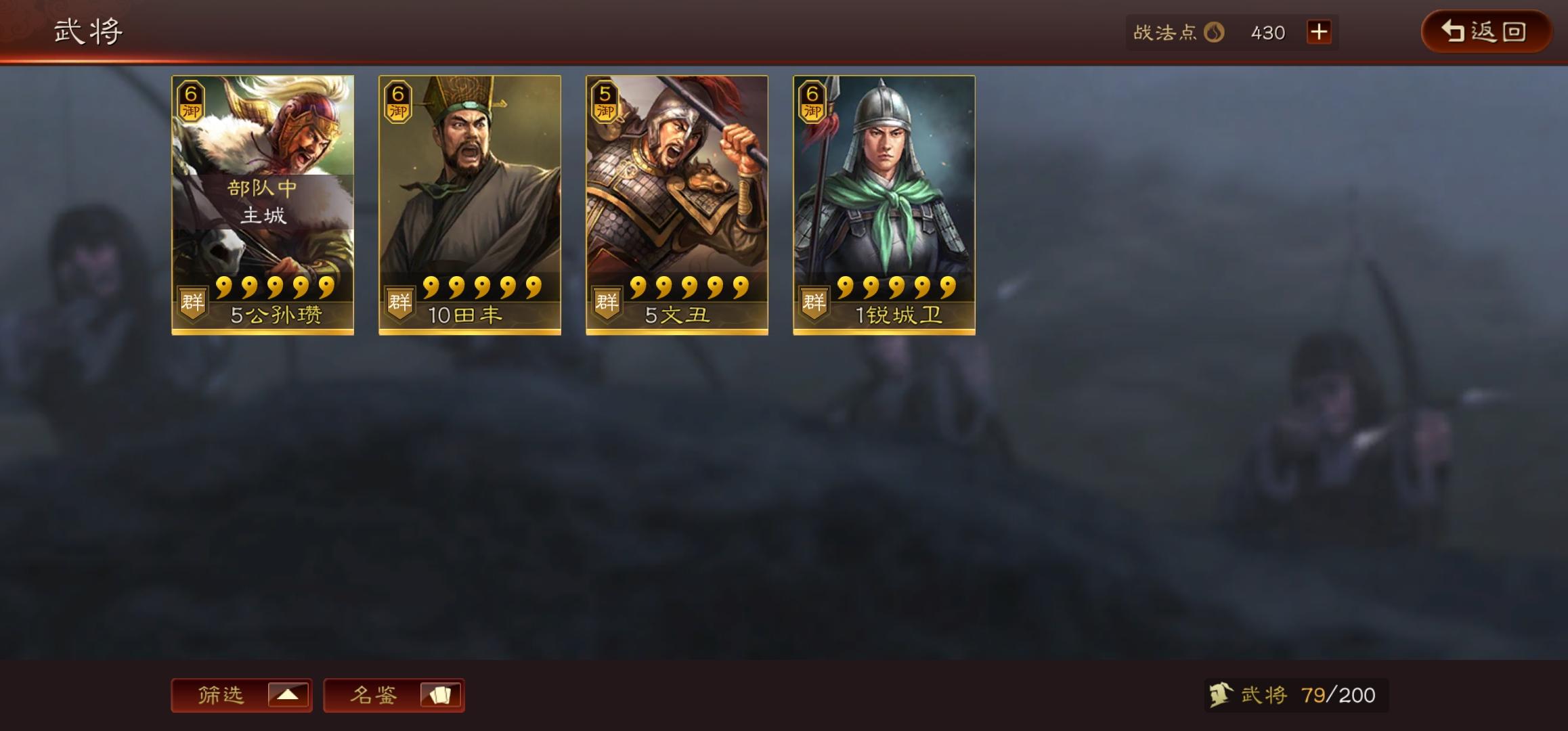 魏:曹操,程昱,夏侯惇,夏侯渊,乐进,许褚 ,曹仁,徐晃,郭嘉,司马懿蜀:诸葛亮,张飞,黄月英,刘备吴:孙尚香,甘宁,太史慈,陆逊,程普,孙策,孙坚,凌统,周泰群:蔡文姬,袁绍,左慈s级战法:夺魂挟魄,杯蛇鬼车,锋矢阵,八门金锁阵,折冲御辱,万箭齐发,白马义从,无当飞军,锦帆军,气凌三军,破阵摧坚,百骑劫营,勇者得前,兵无常势,魅惑,刮骨疗毒,暂避其锋,裸衣血战,西凉铁骑,三势阵,士别三日