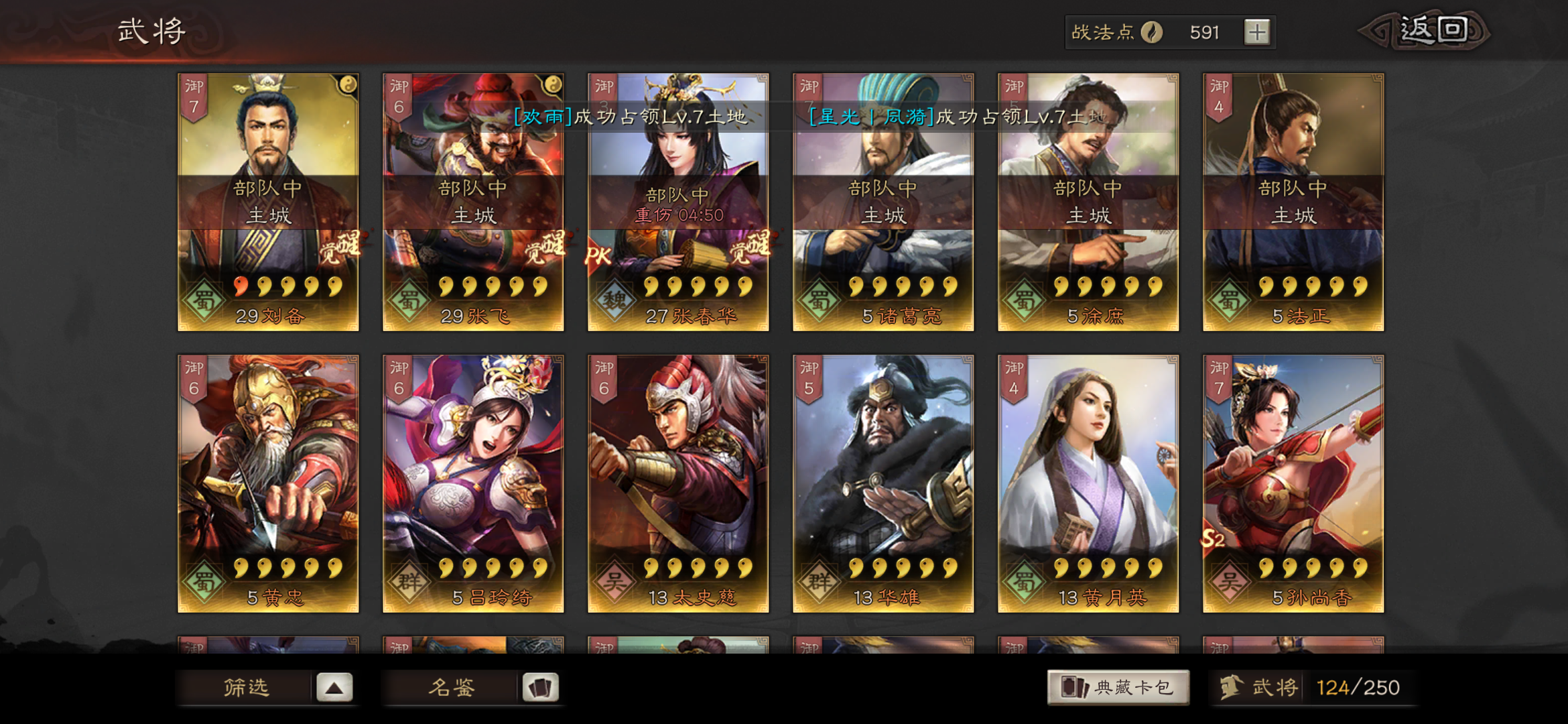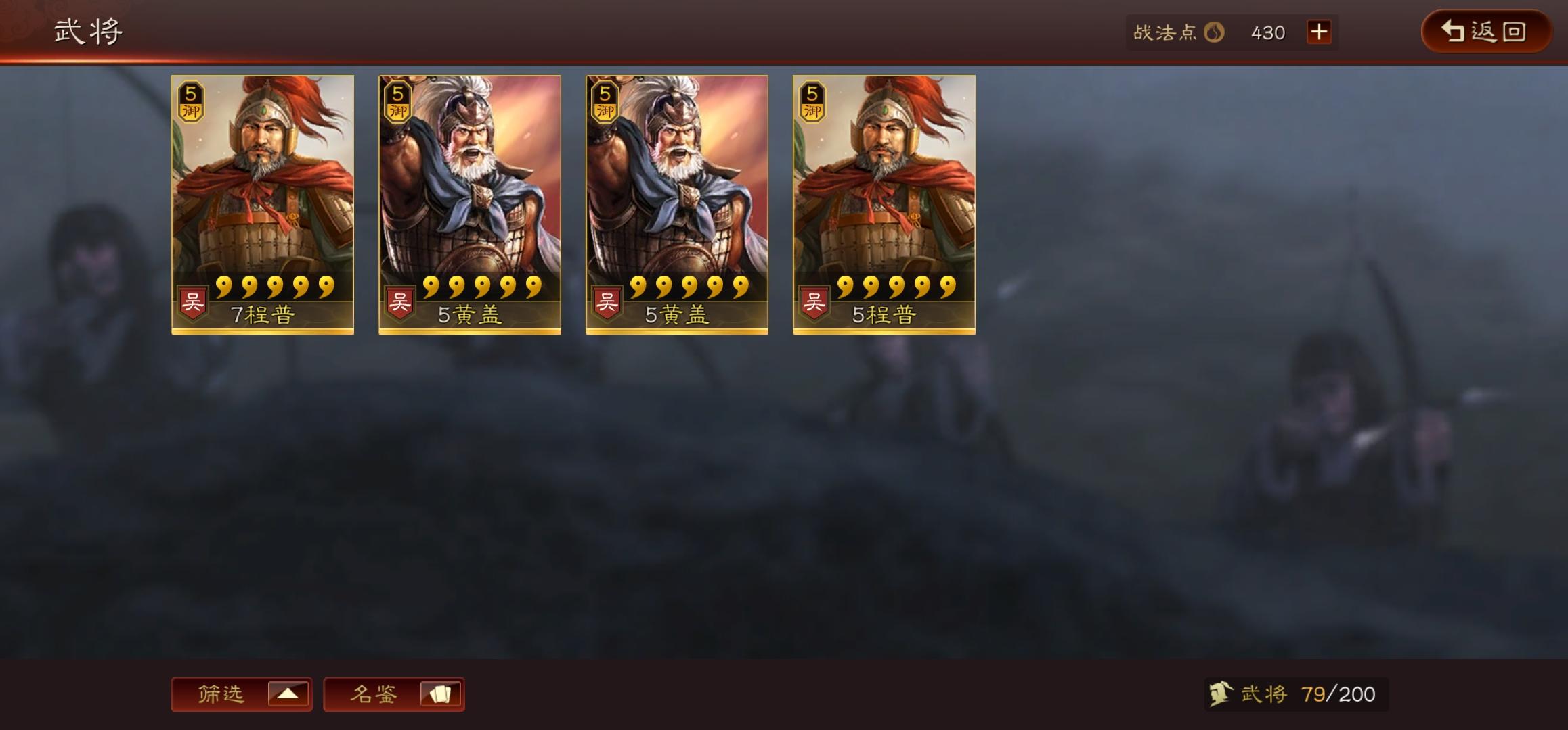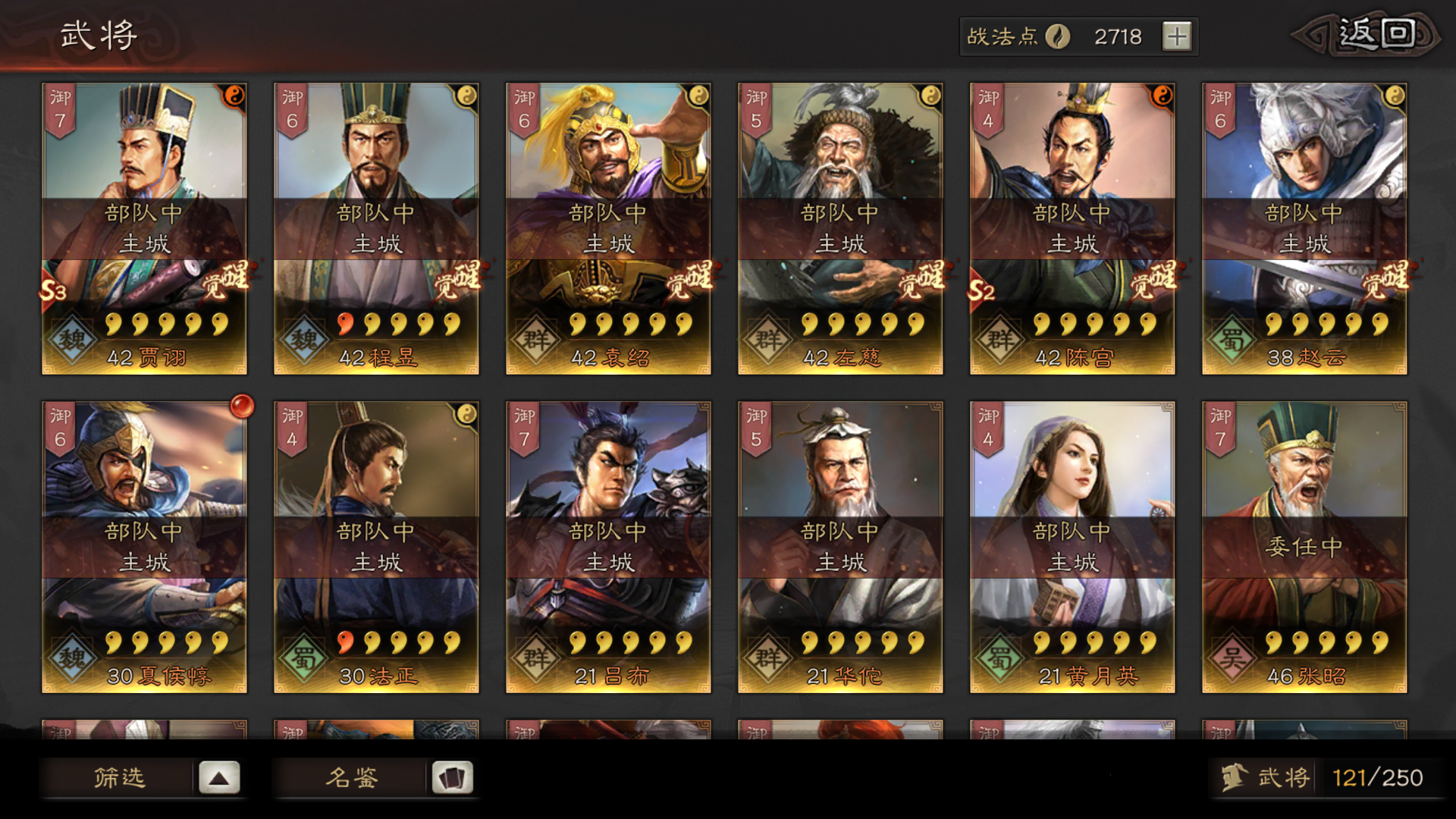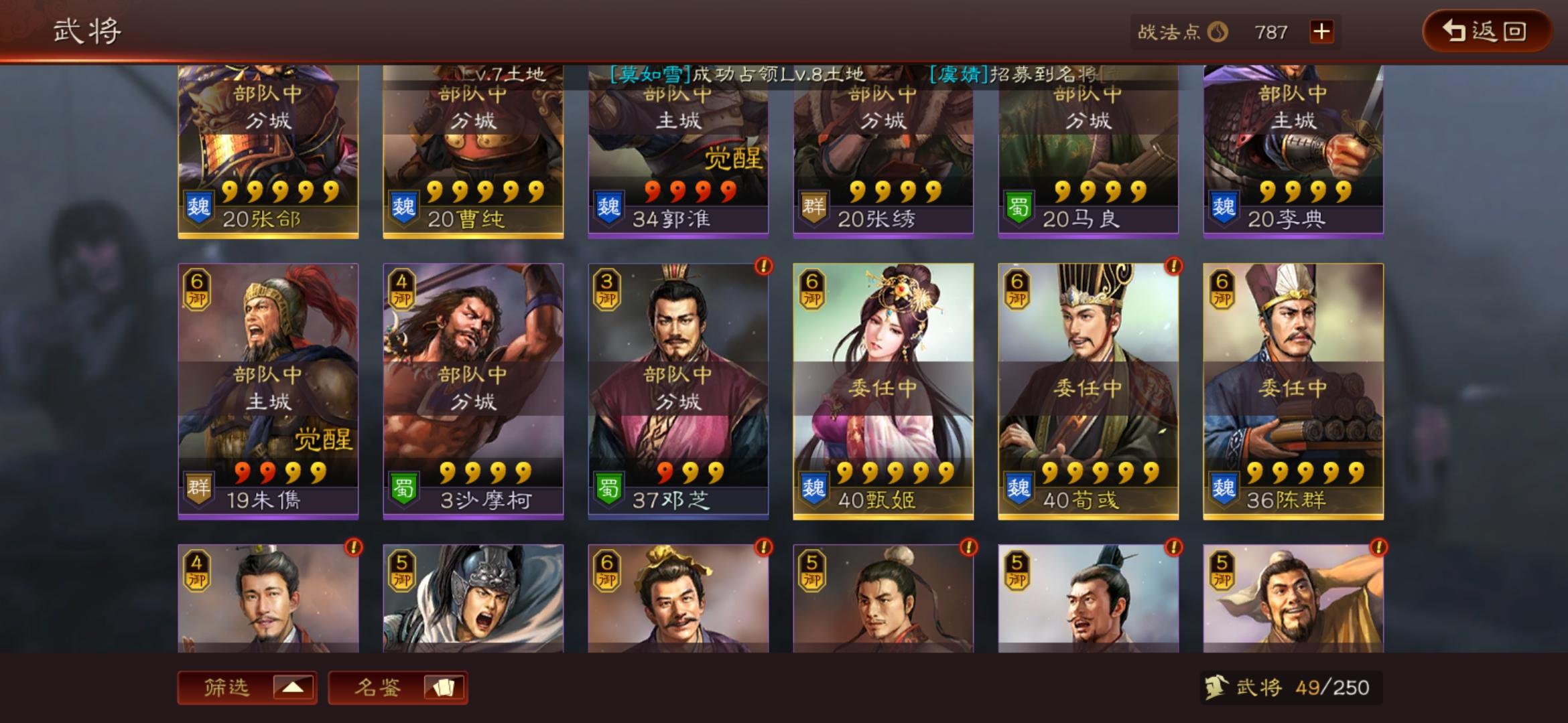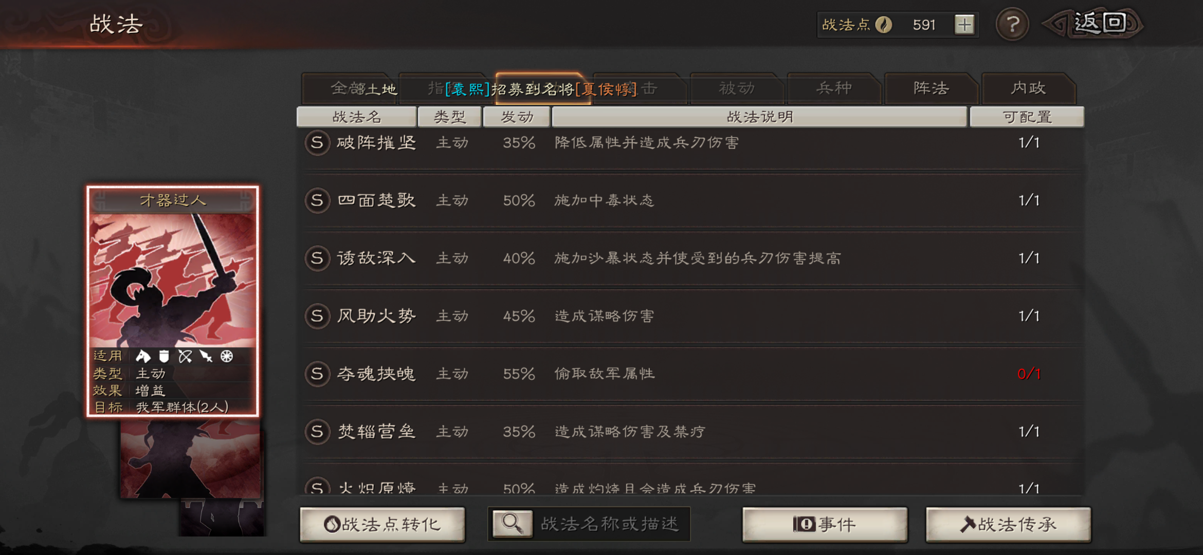 魏:曹操,程昱,夏侯惇,夏侯渊,乐进,许褚 ,曹仁,徐晃,郭嘉,司马懿蜀:诸葛亮,张飞,黄月英,刘备吴:孙尚香,甘宁,太史慈,陆逊,程普,孙策,孙坚,凌统,周泰群:蔡文姬,袁绍,左慈s级战法:夺魂挟魄,杯蛇鬼车,锋矢阵,八门金锁阵,折冲御辱,万箭齐发,白马义从,无当飞军,锦帆军,气凌三军,破阵摧坚,百骑劫营,勇者得前,兵无常势,魅惑,刮骨疗毒,暂避其锋,裸衣血战,西凉铁骑,三势阵,士别三日