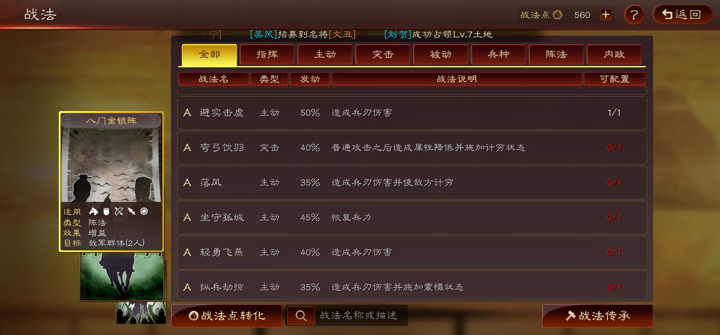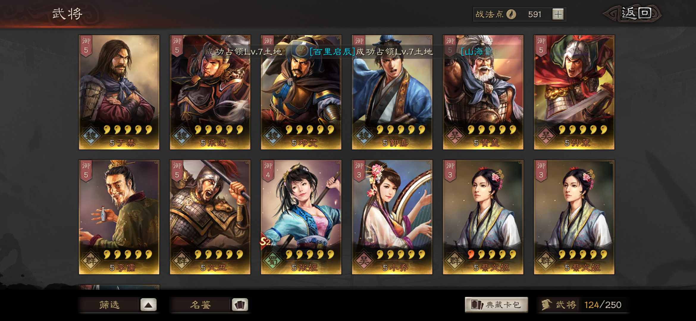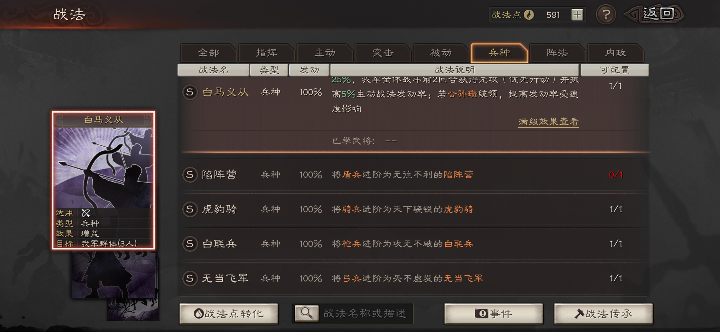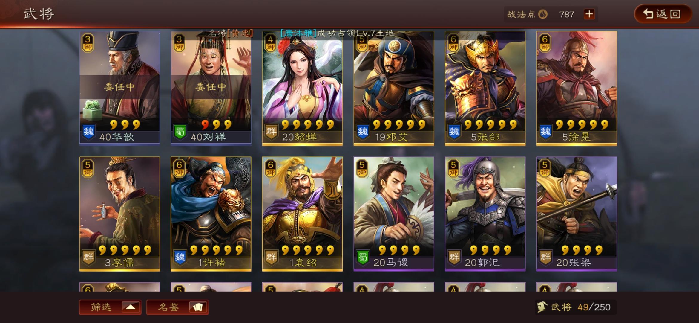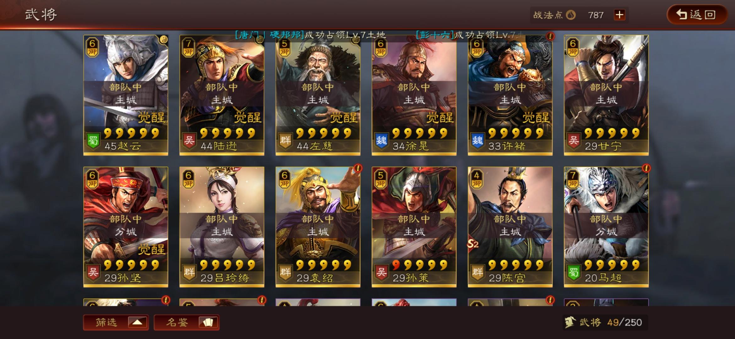 魏:曹操,程昱,夏侯惇,夏侯渊,乐进,许褚 ,曹仁,徐晃,郭嘉,司马懿蜀:诸葛亮,张飞,黄月英,刘备吴:孙尚香,甘宁,太史慈,陆逊,程普,孙策,孙坚,凌统,周泰群:蔡文姬,袁绍,左慈s级战法:夺魂挟魄,杯蛇鬼车,锋矢阵,八门金锁阵,折冲御辱,万箭齐发,白马义从,无当飞军,锦帆军,气凌三军,破阵摧坚,百骑劫营,勇者得前,兵无常势,魅惑,刮骨疗毒,暂避其锋,裸衣血战,西凉铁骑,三势阵,士别三日