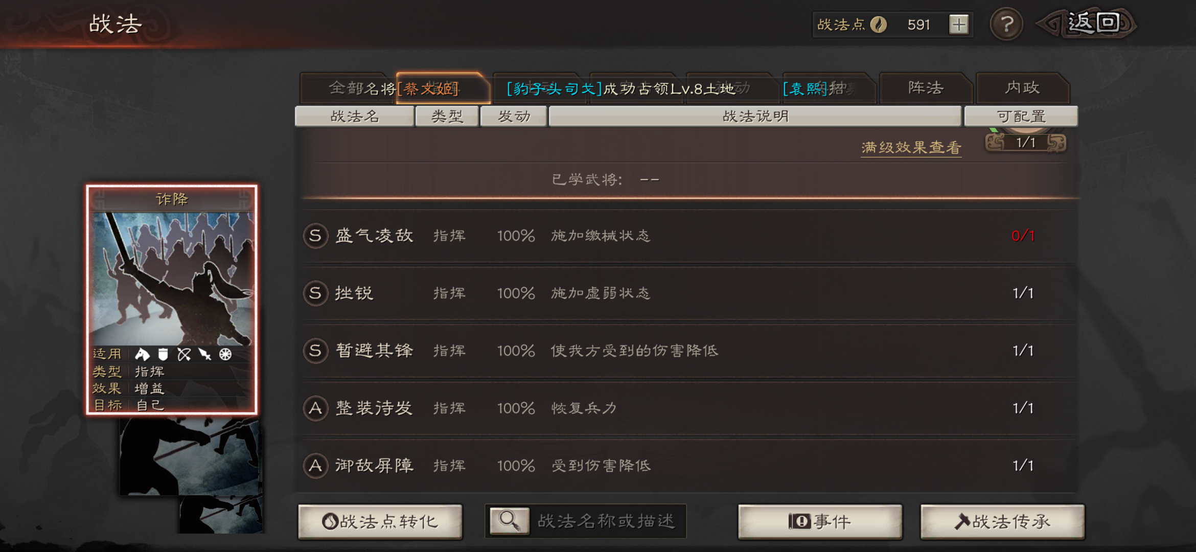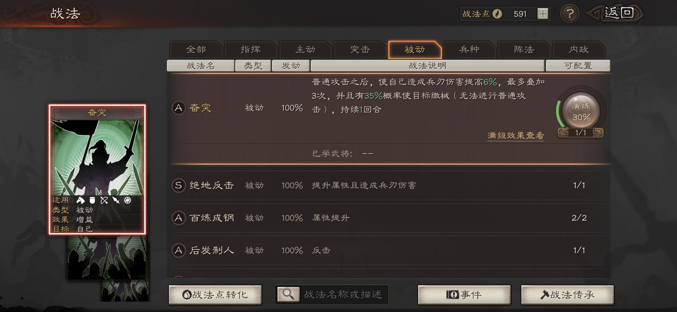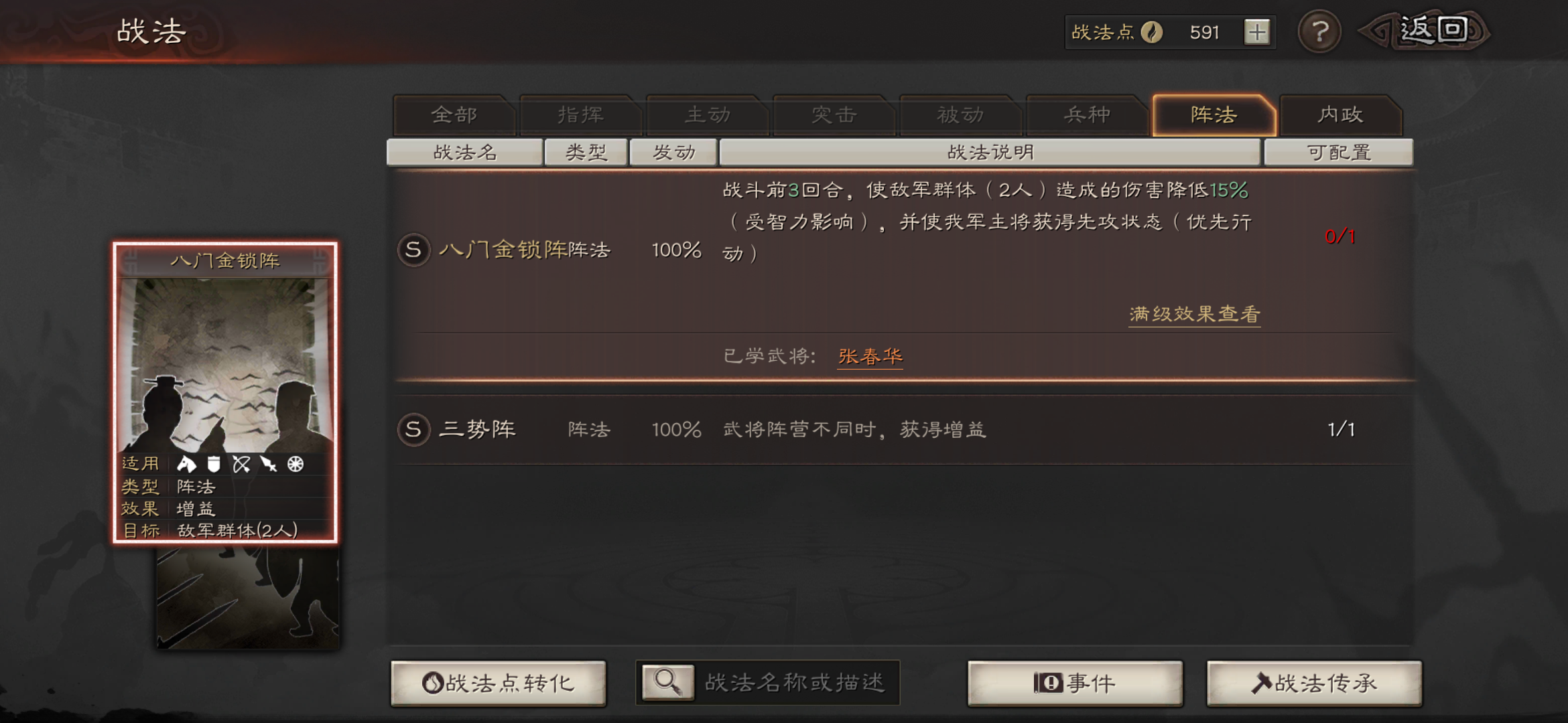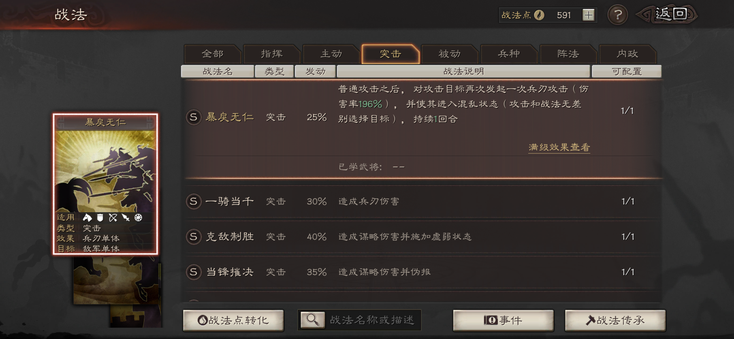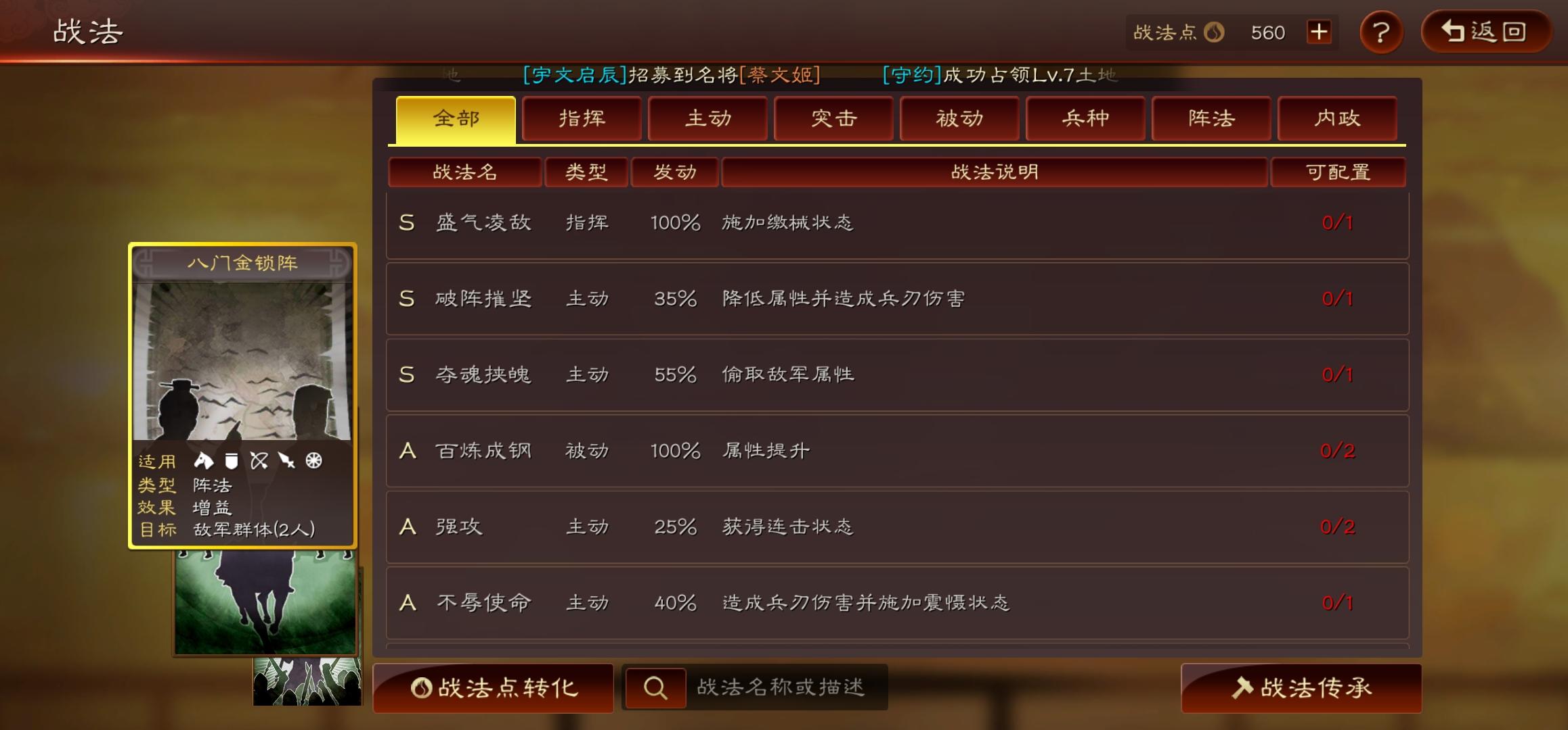 魏:曹操,程昱,夏侯惇,夏侯渊,乐进,许褚 ,曹仁,徐晃,郭嘉,司马懿蜀:诸葛亮,张飞,黄月英,刘备吴:孙尚香,甘宁,太史慈,陆逊,程普,孙策,孙坚,凌统,周泰群:蔡文姬,袁绍,左慈s级战法:夺魂挟魄,杯蛇鬼车,锋矢阵,八门金锁阵,折冲御辱,万箭齐发,白马义从,无当飞军,锦帆军,气凌三军,破阵摧坚,百骑劫营,勇者得前,兵无常势,魅惑,刮骨疗毒,暂避其锋,裸衣血战,西凉铁骑,三势阵,士别三日