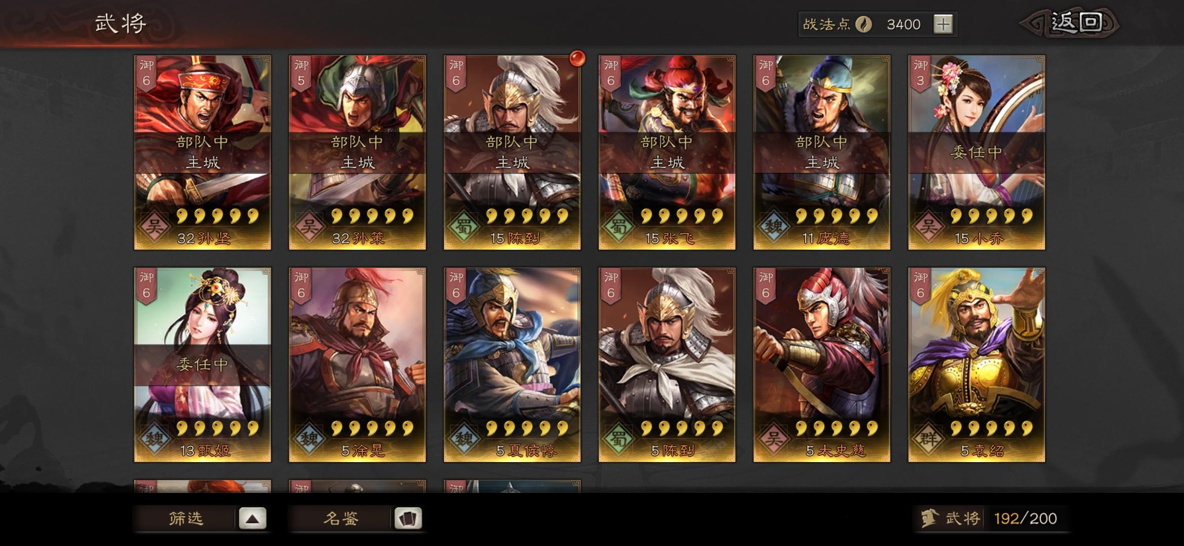 s3 赛季蜀国:刘备 张飞 法正 诸葛亮 徐庶 黄月英魏国:张辽 乐进 郭嘉 许褚 程昱 徐晃 夏侯惇 邓艾吴国:孙尚香 孙权 凌统 甘宁 程普 陆逊 周瑜 黄盖群雄:左慈 吕玲绮 木鹿大王 貂蝉 文丑 李儒 高顺s级战法:指挥战法:盛气凌敌 守而必固 暂避其峰主动战法:夺魄 焚辎营垒 破阵摧坚 四面楚歌 风助火势突击战法:一骑当千 克敌制胜 勇者得前 鬼神霆威 当锋摧决被动战法: