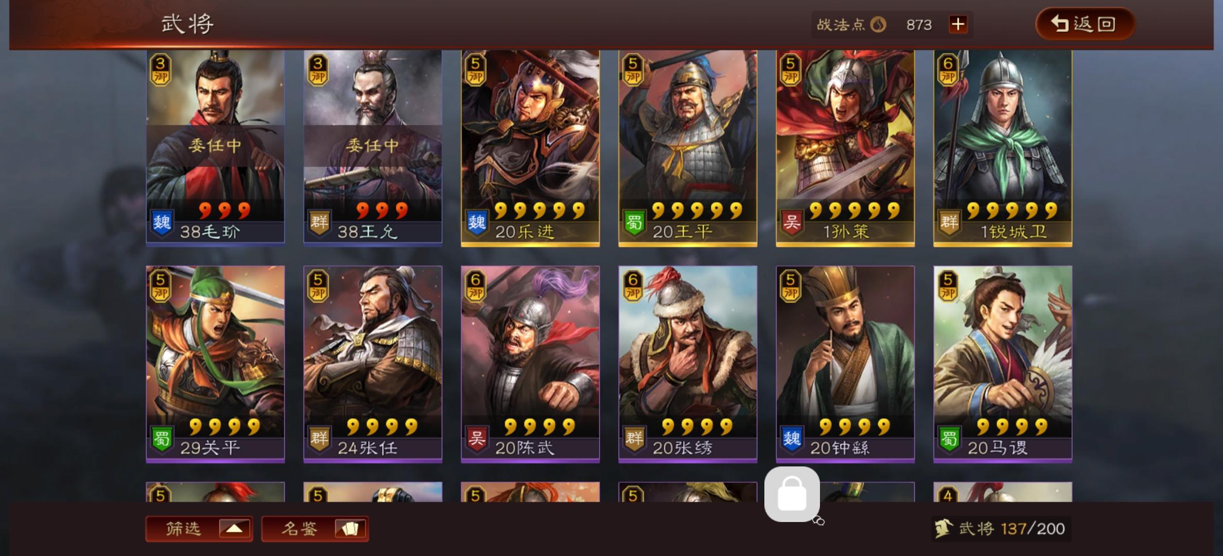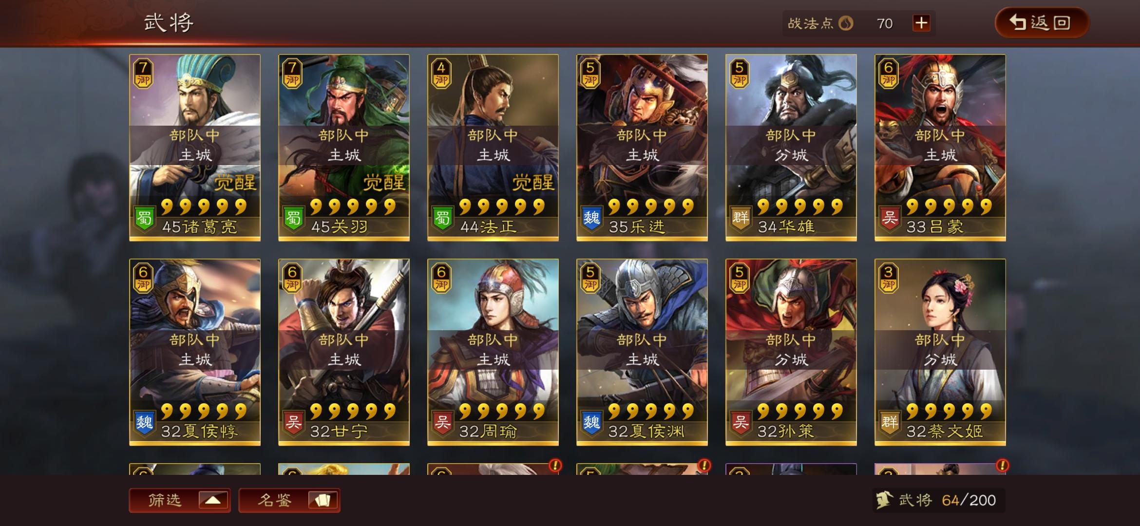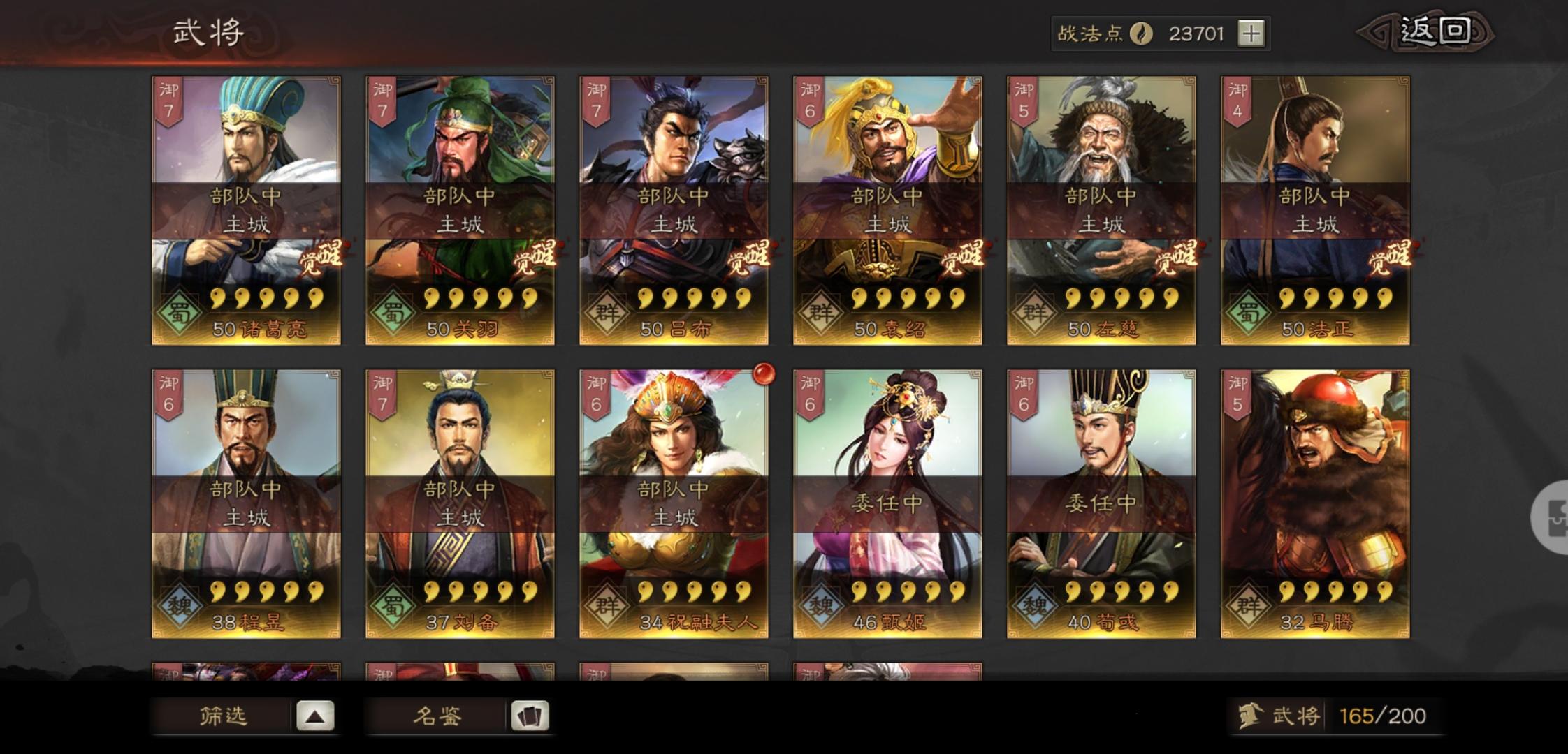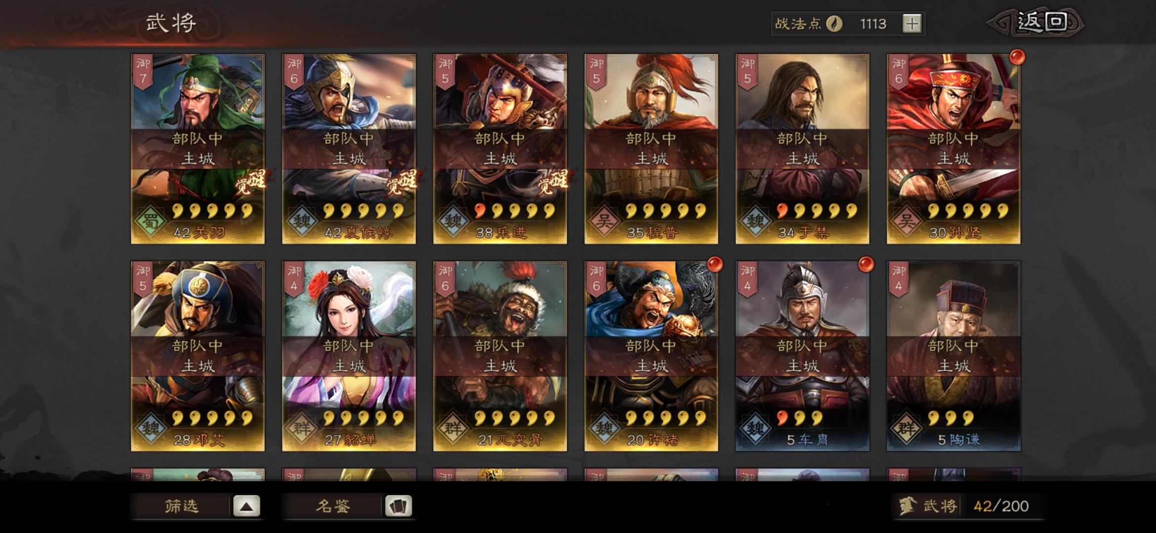 魏国:夏侯渊、张春华、张辽、许褚、程昱、郭嘉蜀国:刘备、诸葛亮、关羽、赵云、徐庶、法正吴国:太史慈、孙尚香、周瑜、程普群雄:颜良、吕布、马腾、华雄、华佗、陈宫S战法:大戟士、气凌三军、所向披靡、盛气凌敌、破阵摧坚、杯蛇鬼车、四面楚歌、八门金锁阵、暴虐无仁、一骑当千、百骑劫营、折冲御悔、守而必固、克敌制胜、风助火势、智计、暂避其锋、勇者得前、魅惑、白马义从、文武双全、兵无常势、西凉铁骑、虎豹