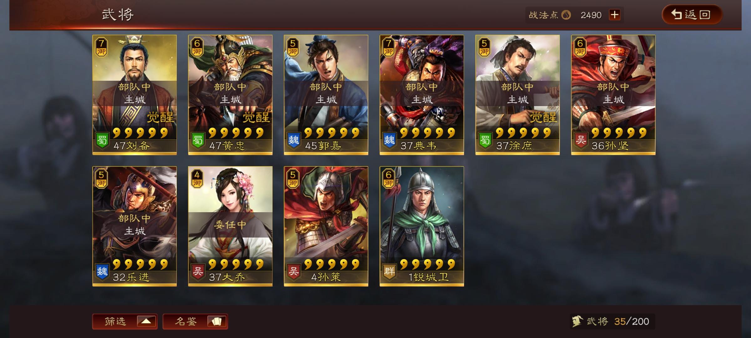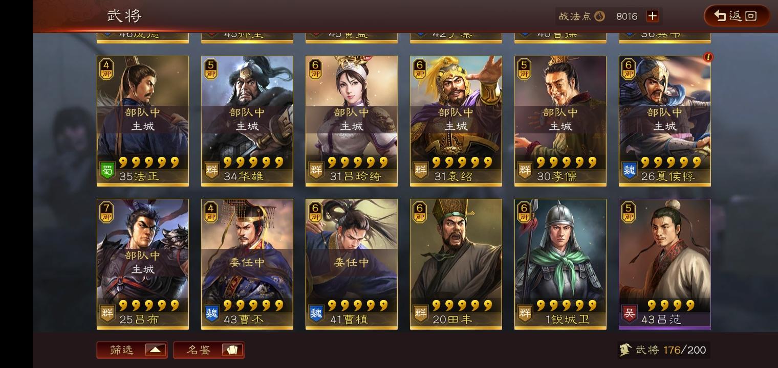 帐号评估噻,s2了魏国:曹操,程煜,夏侯惇,夏侯渊,郭嘉蜀国:刘备,诸葛,庞统,张飞,黄忠吴国:孙策,程普群雄:袁绍,吕布,祝融夫人,吕玲绮,陈宫觉醒了10个将大佬们看看值几个米😸
